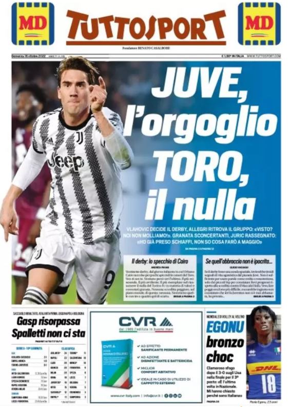 "Juve, l'orgoglio. Toro, il nulla". E' questa l'apertura di Tuttosport in prima pagina, descrivendo così un derby di sicuro non bello da vedere. "Gasp risorpassa, Spalletti non ci sta", si legge invece in merito alla bagarre in vetta con l'Atalanta che ha scavalcato il Napoli grazie al successo col Bologna.