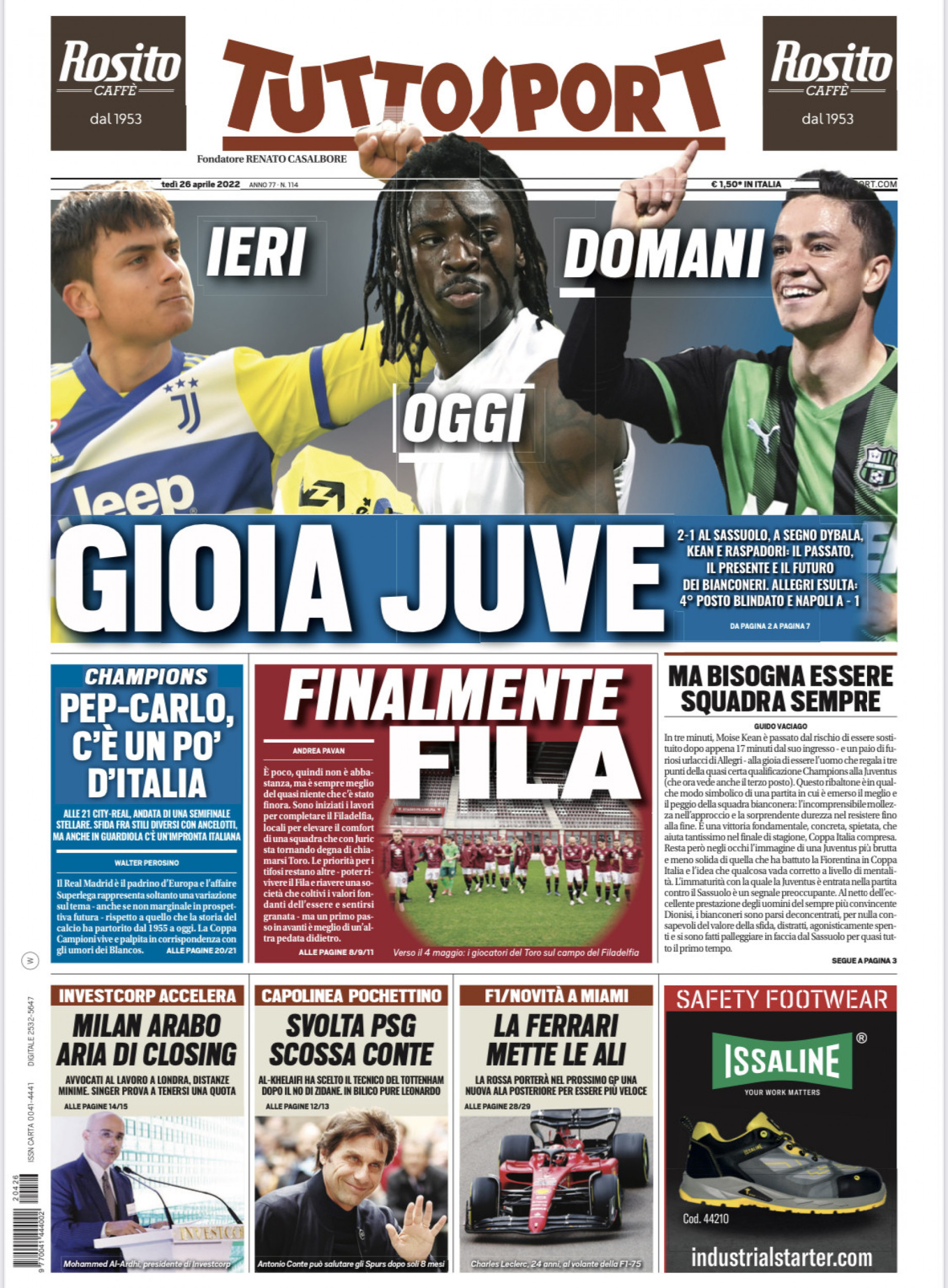 “Gioia Juve”, è questa l’apertura di Tuttosport che si concentra sulla vittoria dei bianconeri contro il Sassuolo. In taglio centrale spazio al Torino: "Finalmente Fila". Di spalla si parla della Champions League: "Pep-Carlo c'è un po' d'Italia". In taglio basso spazio ai rossoneri: "Milan arabo aria di closing". Spazio anche alla panchina del Paris Sainte-Germain: "Svolta PSG scossa Conte".