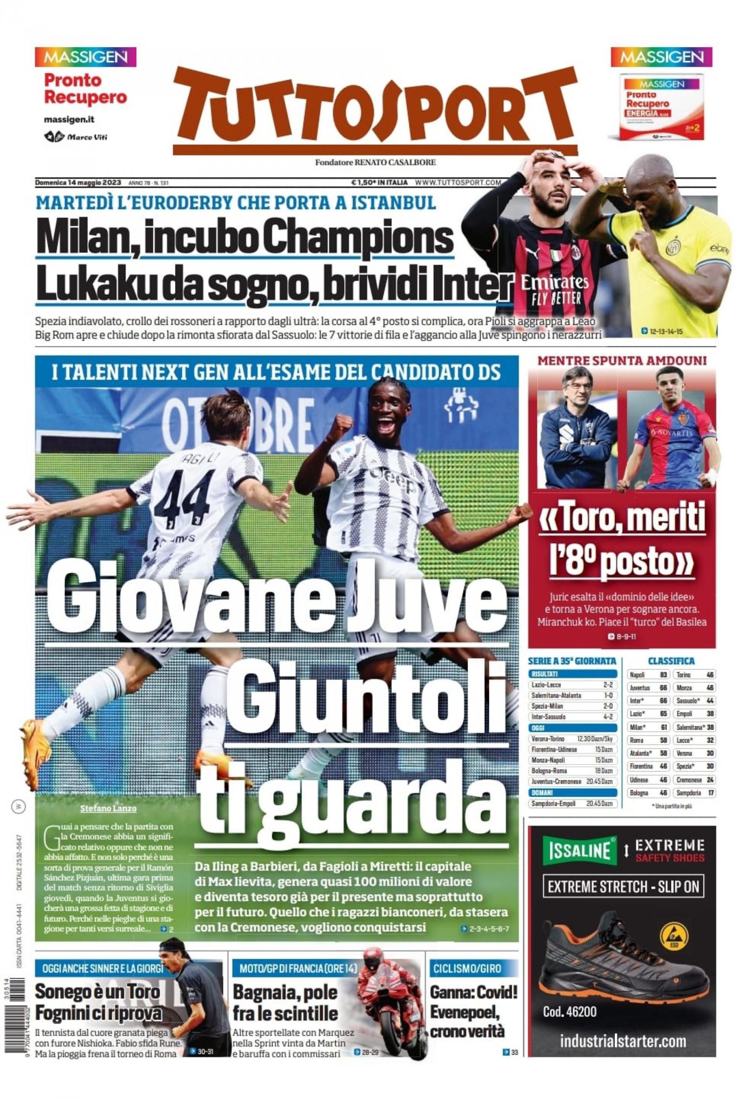 Tuttosport, nell'edizione odierna, dedica l'apertura in prima pagina alla Juventus: "Giovane Juve, Giuntoli ti guarda. I talenti Next Gen all'esame del candidato ds". In taglio alto spazio alla Serie A: "Milan, incubo Champions. Lukaku da sogno, brividi Inter". In colonna a destra spazio al Torino: "Toro, meriti l'8° posto".