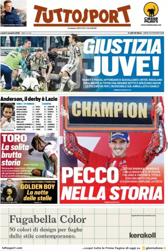 Tuttosport, nell'edizione odierna, apre in prima pagina con la vittoria della Juventus contro l'Inter: "Giustizia Juve! Rabiot e Fagioli affondano e scavalcano l'Inter, regalano finalmente ai tifosi una grande notte e spazzano anche le polemiche per l'incredibile gol annullato a Danilo". Di spalla spazio al Derby capitolino: "Anderson, il derby è Lazio". In taglio basso la vittoria del Mondiale Moto Gp da parte di Bagnaia: "Pecco nella storia".