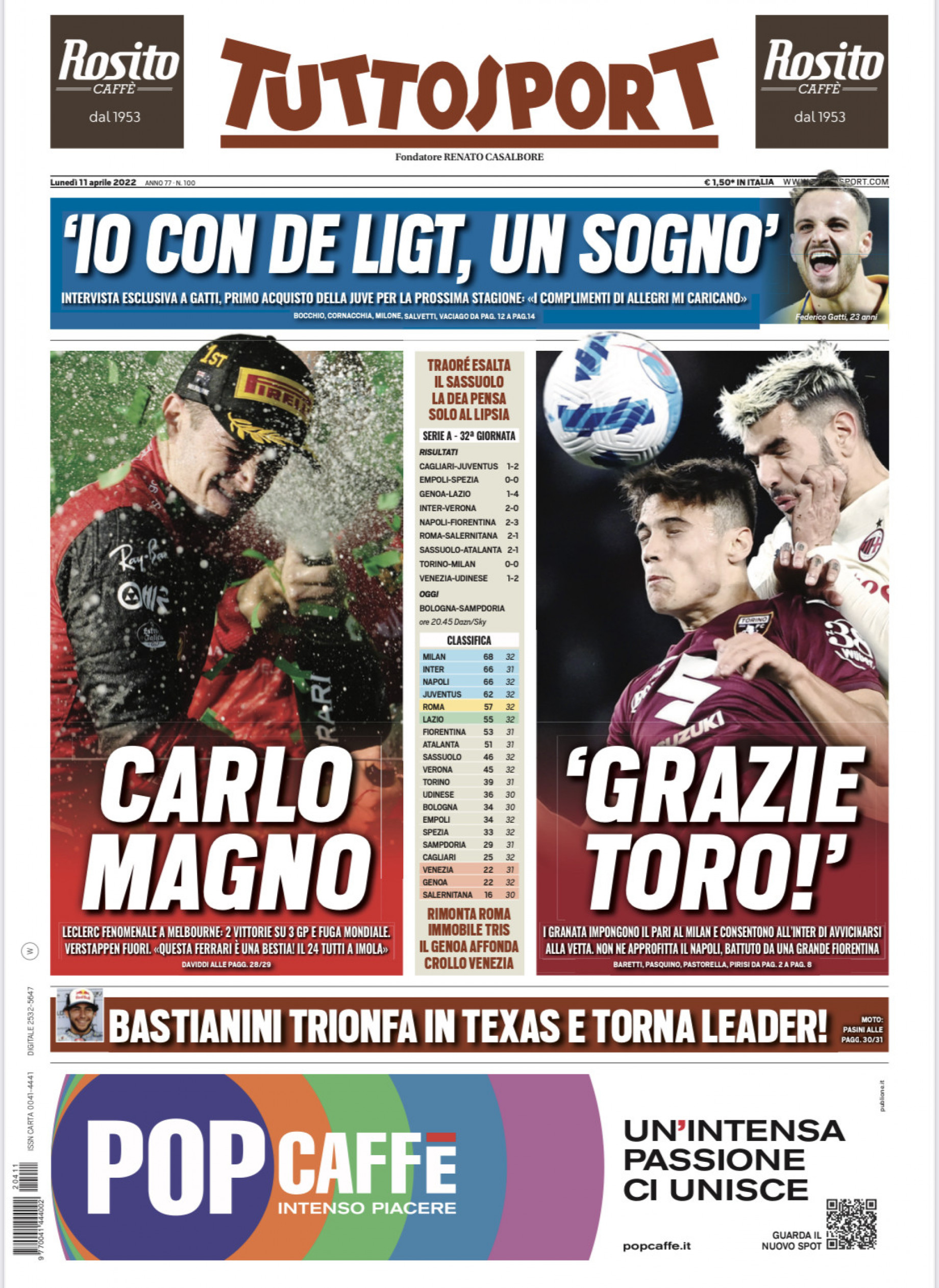 Tuttosport, nell'edizione di oggi, dà spazio in prima pagina al pareggio tra Torino e Milan che frena i rossoneri: "Grazie Toro! I granata impongono il pari al Milan e consentono all'Inter di avvicinarsi alla vetta. Non ne approfitta il Napoli, battuto da una grande Fiorentina". In taglio alto spazio all'intervista a Gatti, primo acquisto bianconero della prossima stagione: "Io con De Ligt, un sogno".