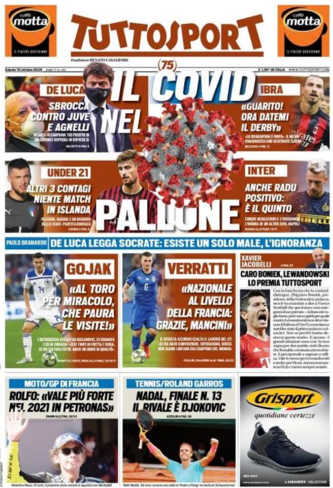 "Il Covid nel pallone". Questo il titolo di apertura in prima pagina di Tuttosport questa mattina. De Luca sborcca contro la Juve e Agnelli. Intanto in Campania 769 positivi in un giorno e ospedali in difficoltà. Ibra: "Guarito! Ora datemi il derby. La quarantena è finita". Il Milan riabbraccia uno scatenato Zlatan. Nell'Under 21 altri 3 contagi e niente match in Islanda. Plizzari, Gabbia e un membro dello staff positivi: partita rinviata. Inter, anche Radu è positivo: è il quinto. Cinque nerazzurri e due rossoneri. L'ombra di un altro Juve-Napoli.