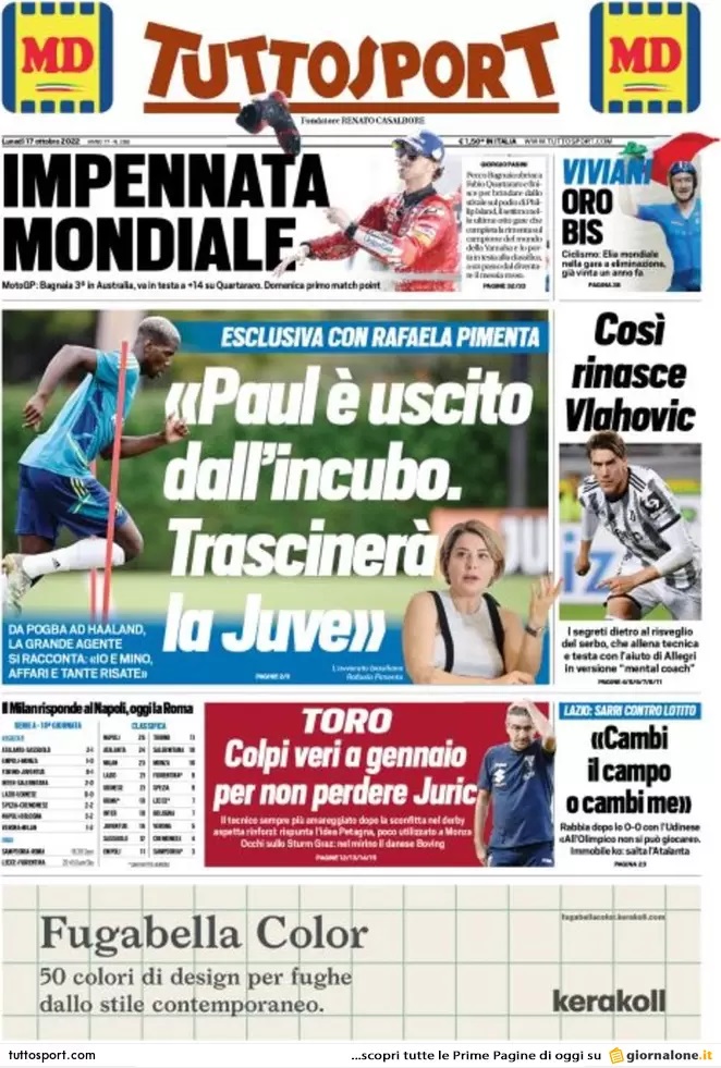 "Il Milan risponde al Napoli, oggi la Roma", titola così in prima pagina Tuttosport nell'edizione di oggi. In apertura l'intervista all'agente di Paul Pogba: "Paul è uscito dal tunnel. Trascinerà la Juve". In taglio basso spazio al Torino in ottica gennaio: "Toro, colpi veri a gennaio per non perdere Juric".