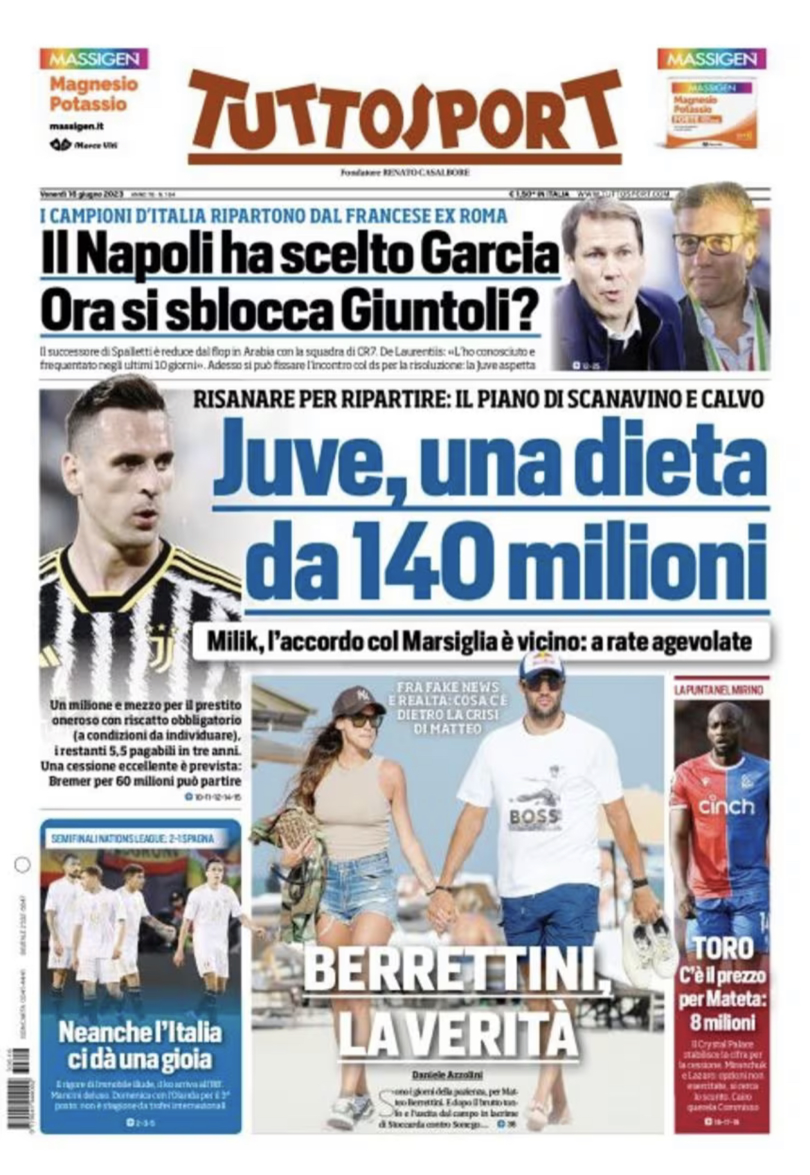 “Il Napoli ha scelto Garcia. Ora si sblocca Giuntoli?”. Titola così l’edizione odierna di Tuttosport. "I campioni d'Italia ripartono dal francese ex Roma. Il successore di Spalletti è reduce dal flop in Arabia con la squadra di CR7. De Laurentiis: 'L'ho conosciuto e frequentato negli ultimi 10 giorni'. Adesso si può fissare l'incontro col ds per la risoluzione; la Juve aspetta". Al centro ampio spazio dedicato alla Juve: "Una dieta da 140 milioni". In basso si parla anche dell'Italia, sconfitta in Nations League contro la Spagna.