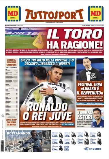 Tuttosport apre oggi in prima pagina col verdetto in sospeso di Lazio-Torino, gara non disputata ieri dopo l'impedimento granata causa Covid: "Il Toro ha ragione!". Di spalla spazio alle dichiarazioni di Zlatan Ibrahimovic al Festival di Sanremo, il bomber rossonero tende la mano al 'nemico' nerazzurro: "Lukaku è il benvenuto".