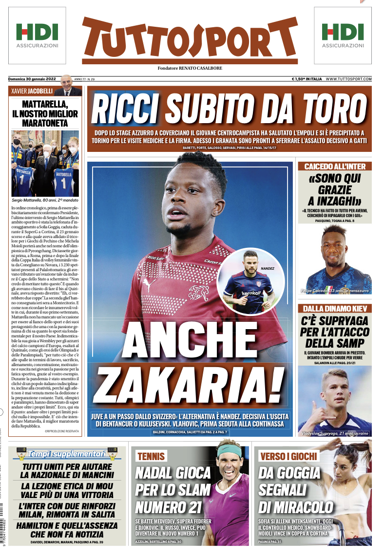 Il mercato in entrata della Juventus non si ferma a Dusan Vlahovic. I bianconeri, dopo aver messo a segno un colpo importante per l'attacco sono vicini da Zakaria del Borussia Monchengladbach, pedina per il centrocampo di Massimiliano Allegri. Questo il titolo in prima pagina dell'edizione odierna di Tuttosport: "Anche Zakaria!".