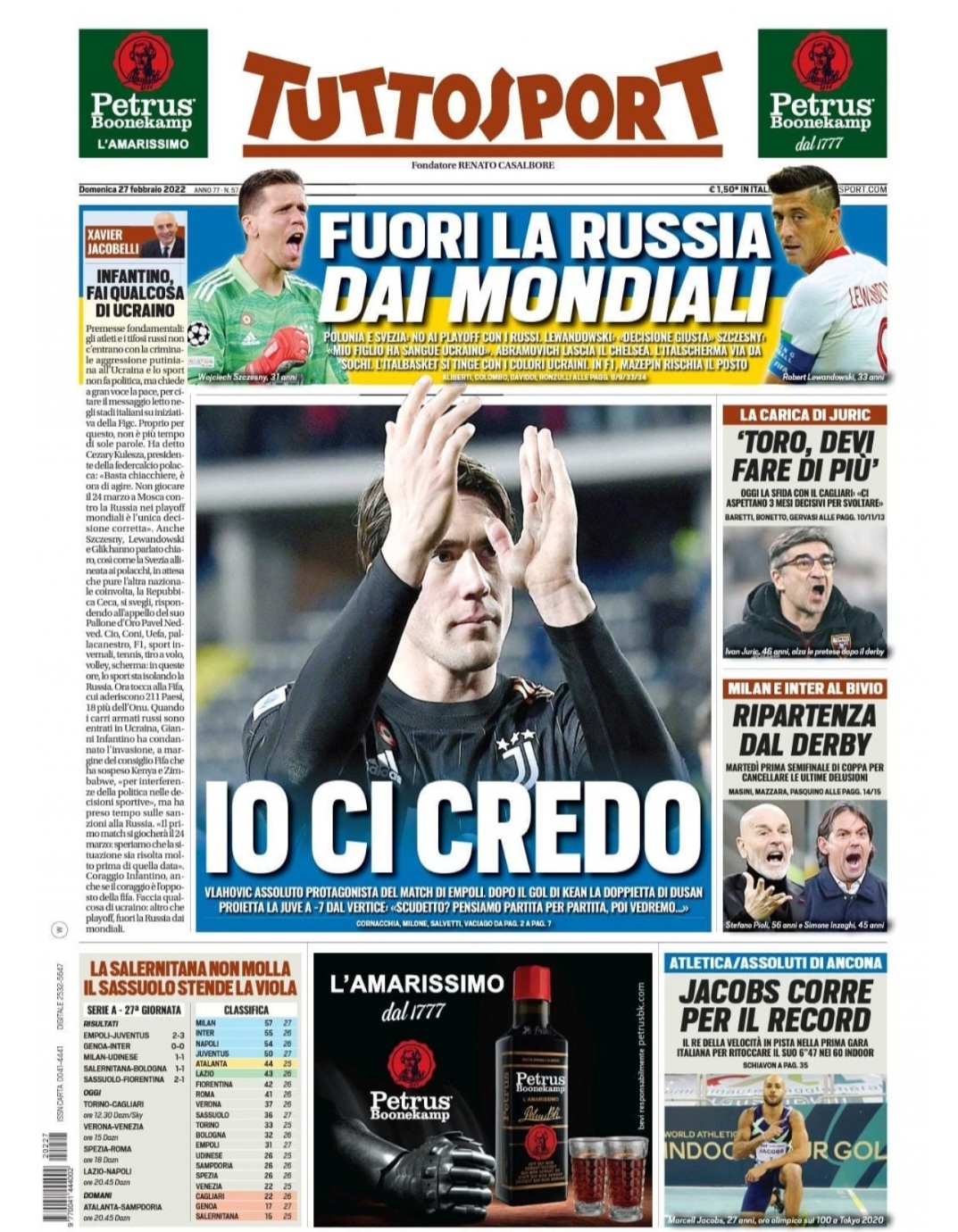 "Fuori la Russia dai Mondiali". È questo il titolo che Tuttosport propone in taglio alto, raccontando di come Polonia e Svezia non abbiano intenzione di giocare contro la Russia agli spareggi per i Mondiali. In primo piano le parole di Vlahovic, trascinatore della Juventus: "Io ci credo".