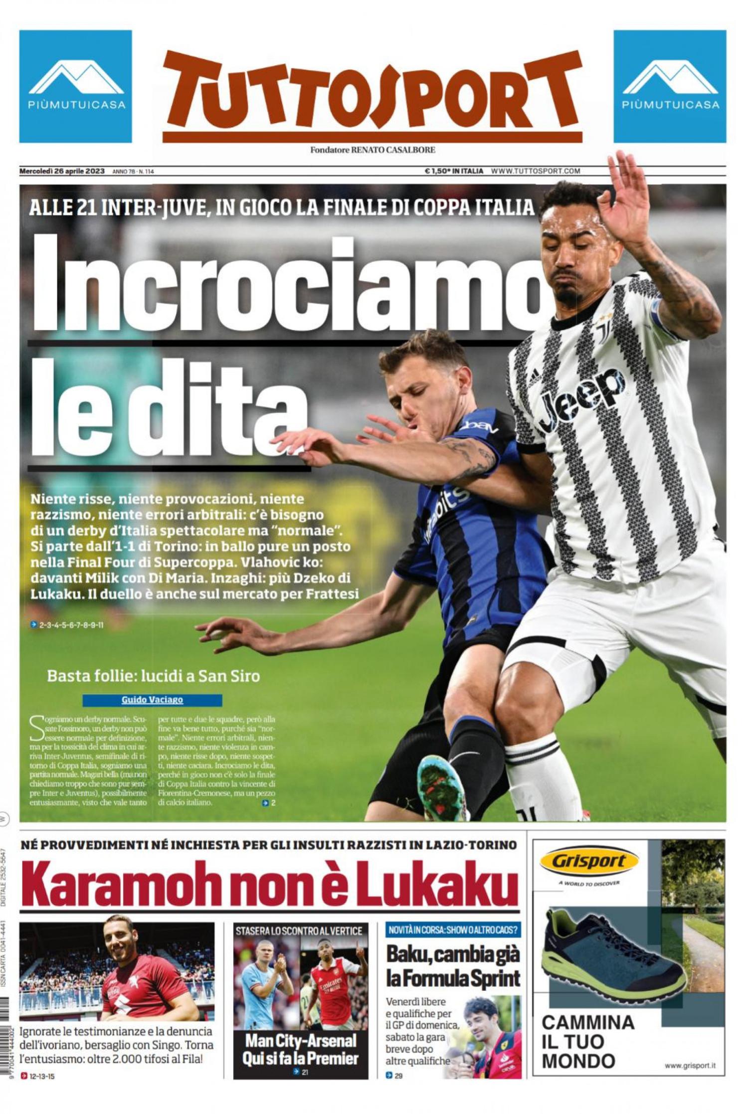 Tuttosport, nell'edizione di oggi, apre con l'attesa di Inter-Juventus, semifinale di ritorno di Coppa Italia: "Incrociamo le dita. Niente risse, niente provocazioni, niente razzismo, niente errori arbitrali: c'è bisogno di un derby d'Italia spettacolare ma 'normale'". In taglio basso spazio per l'episodio di insulti razzisti in Lazio-Torino: "Karamoh non è Lukaku".