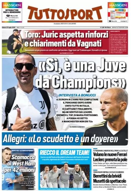 Tuttosport intervista Leonardo Bonucci: "Sì, è una Juve da Champions", titola il quotidiano piemontese riportando il virgolettato del difensore bianconero: "L'Europa in 2 anni per completare il percorso dopo avere vinto tutto in Italia".
