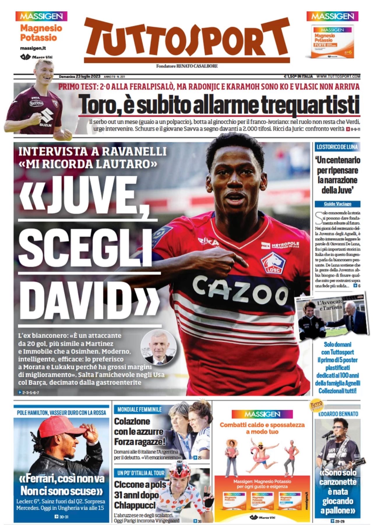 "Juve, scegli David", si legge sulla prima pagina di Tuttosport in edicola oggi. Fabrizio Ravanelli, ex attaccante bianconero, ha consigliato il centravanti del Lille: "È un attaccante da 20 gol, più simile a Martinez e Immobile che a Osimhen. Moderno, intelligente, efficace: lo preferisco a Morata e Lukaku perché ha grossi margini di miglioramento".
