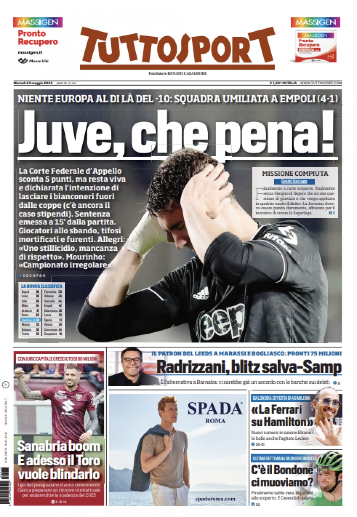 “Juve, che pena”. Titola così al centro l’edizione odierna di Tuttosport. "Niente Europa al di là del -10: squadra umiliata a Empoli (4.1). La Corte federale d'appello sconta 5 punti, ma resta viva e dichiarata l'intenzione di lasciare i bianconeri fuori dalle coppe". In basso spazio al Torino.