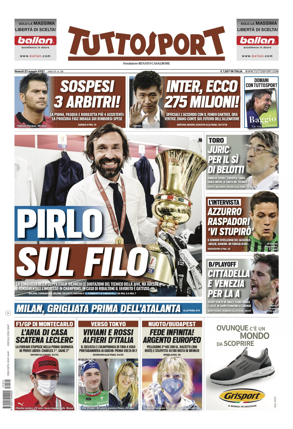 Tuttosport apre in prima pagina con l’allenatore della Juve che si gioca la riconferma: "Pirlo sul filo. La conquista della Coppa Italia rilancia le ambizioni del tecnico della Juve. Ma adesso è fondamentale l'ingresso in Champions. In caso di ribaltone il favorito è Gattuso". In taglio alto, spazio all'accordo Inter-Oaktree: "Inter, ecco 275 milioni", e all'indagine della Procura sui rimborsi spese per gli arbitri: "Sospesi 3 arbitri". Di spalla, focus sull'idea Juric per il Torino e alla finale playoff di Serie B.