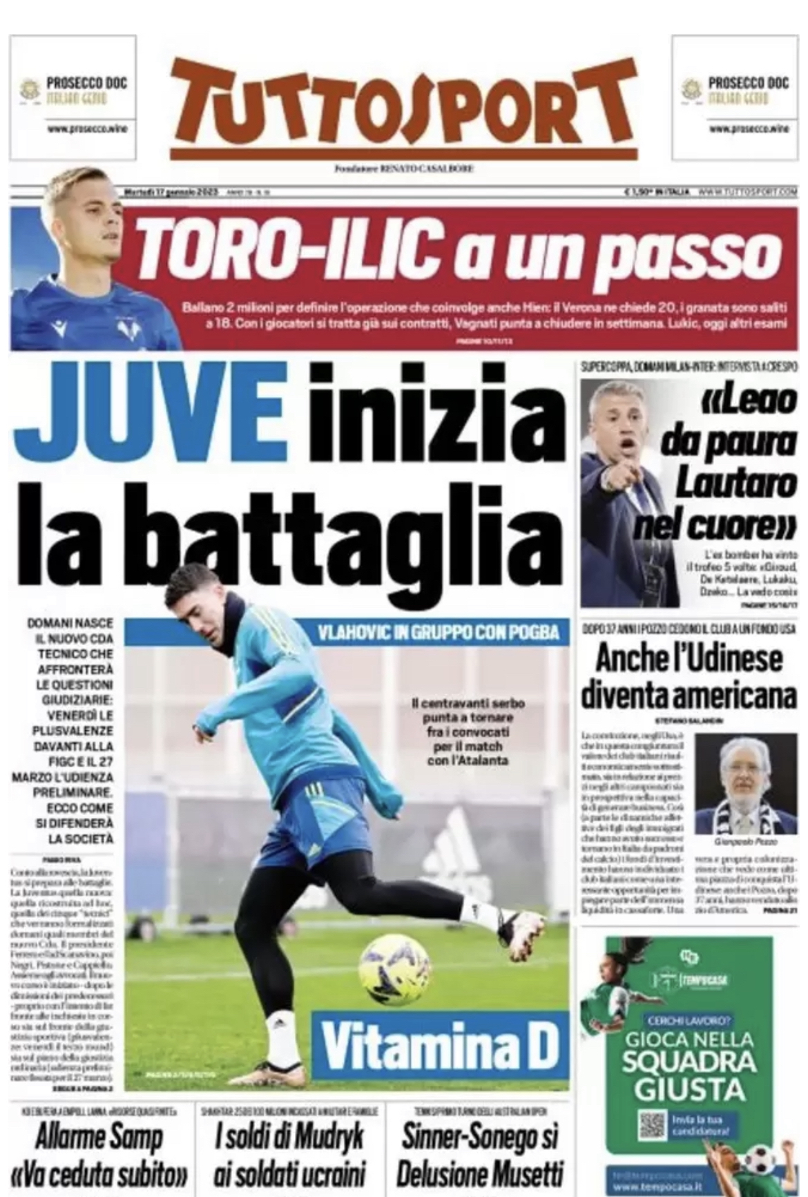 “Juve, inizia la battaglia”. Titola così l’edizione odierna di Tuttosport. "Domani nasce il nuovo CdA tecnico che affronterà le questioni giudiziarie: venerdì le plusvalenze davanti alla Figc e il 27 marzo l'udienza preliminare. Ecco come si difenderà la società". In taglio alto spazio al Torino: "Toro-Ilic a un passo". Di spalla l'intervista ad Hernan Crespo.