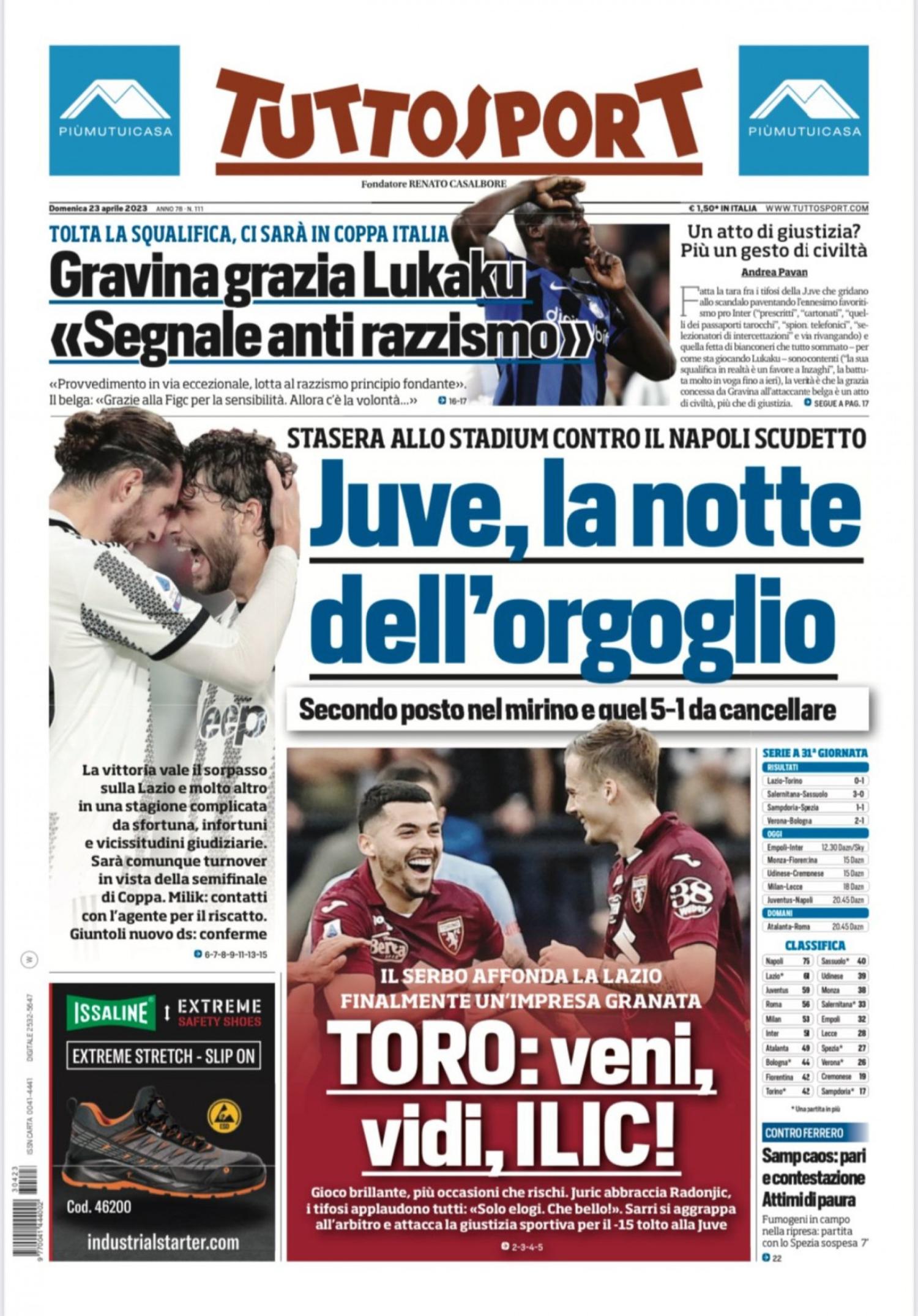 "Juve, la notte dell'orgoglio", apre così Tuttosport in prima pagina nell'edizione di oggi. "Stasera allo Stadium contro il Napoli scudetto. Secondo posto nel mirino e quel 5-1 da cancellare". A centro pagina spazio al Torino, che ha ferma la Lazio all'Olimpico grazie a un gol dalla distanza di Ilic: "Toro: veni, vidi, Ilic". In taglio alto la decisione di Gravina di rimuovere la squalifica a Lukaku in Coppa Italia: "Gravina grazia Lukaku: 'Segnale anti razzismo'".