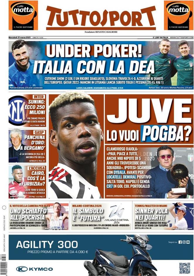 Tuttosport, nell'edizione di oggi, apre in prima pagina con le dichiarazioni di Mino Raiola: "Juve lo vuoi Pogba? Paul piace a tutti, anche mio nipote di 5 anni gli troverebbe una squadra". In alto spazio alle gare della Nazionale maggiore di stasera e a quella vinta ieri dall' Under 21: "Under poker! Italia con la Dea. In Lituania Mancini lancia subito Toloi e Pessina".