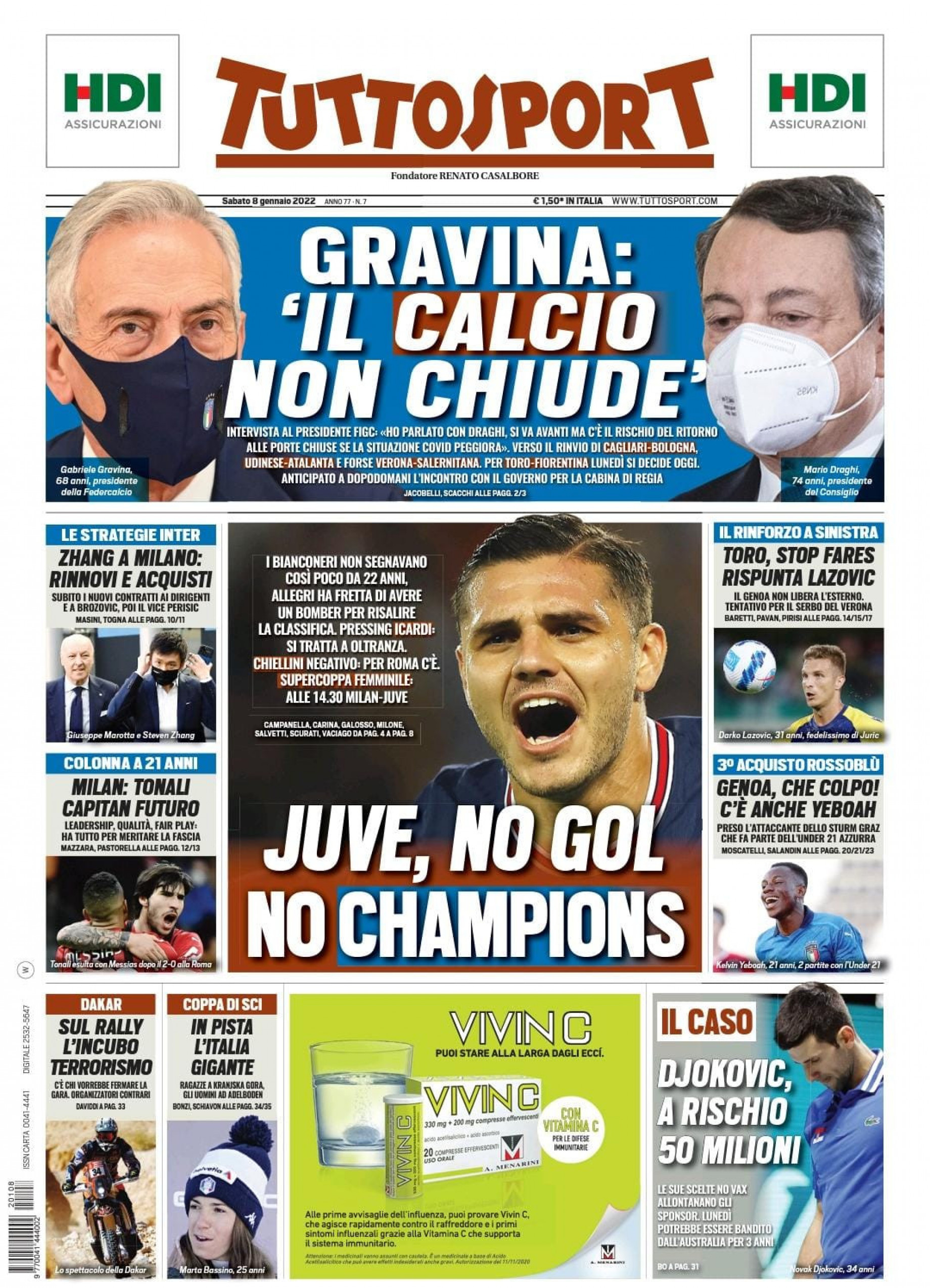 "Juve no gol, no Champions", si legge in prima pagina sull'edizione odierna del quotidiano Tuttosport evidenziando che i bianconeri non segnavano così poco da addirittura 22 anni. Allegri ha fredda di avere un bomber per risalire in classifica ed il club è in pressing per Icardi. In taglio alto le parole di Gravina che assicura che il calcio non chiuderà gli stadi.