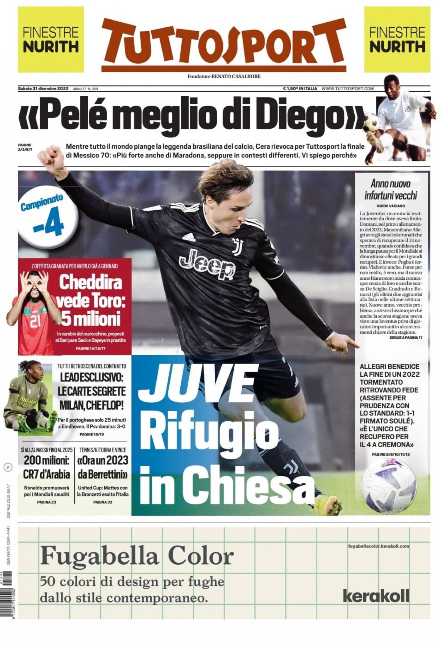 Nell'edizione odierna Tuttosport riporta in prima pagina in taglio alto le parole di Pierluigi Cera: "Pelé meglio di Diego". In apertura spazio a Federico Chiesa: "Juve, rifugio in Chiesa". Di spalla il mercato del Torino: "Cheddira vede Toro: 5 milioni" e l'intervista esclusiva a Leao: "Leao esclusivo: le carte segrete. Milan, che flop!".