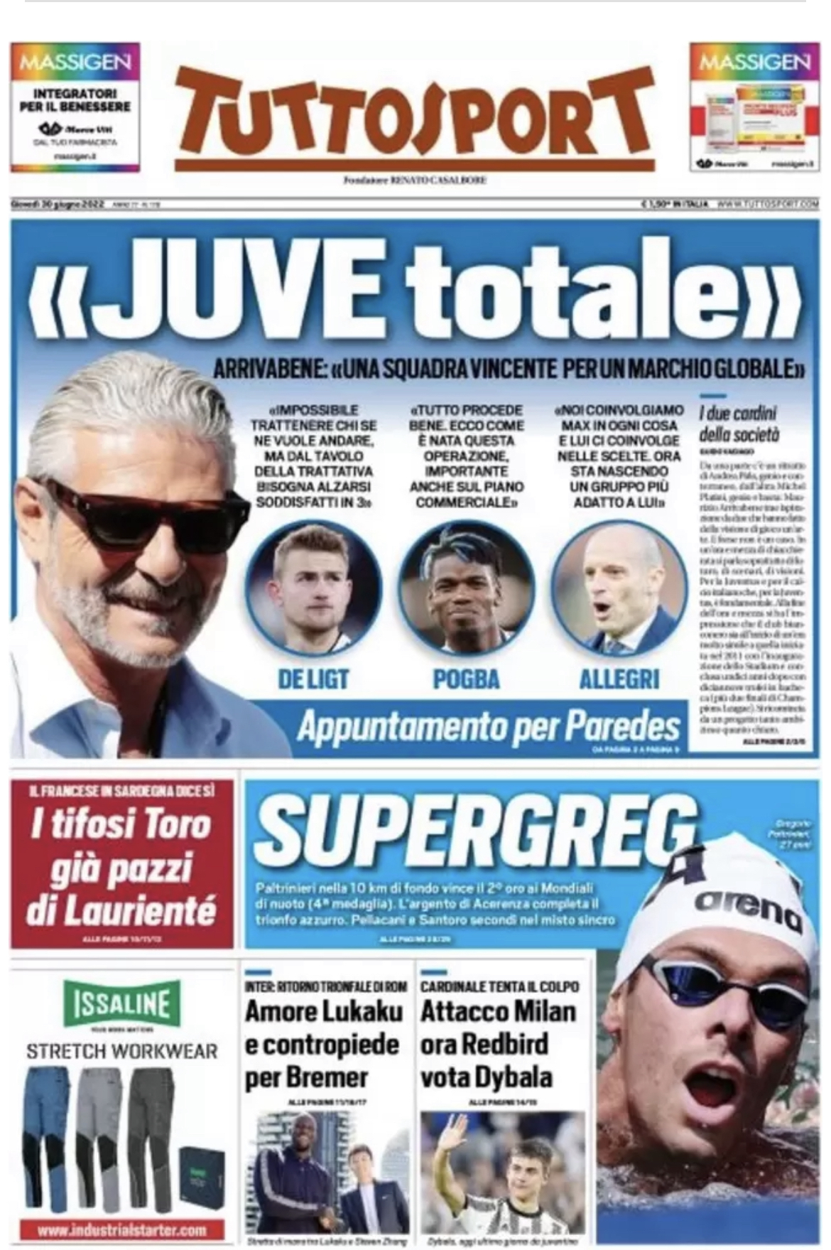 “Juve totale”. E’ questa l’apertura di Tuttosport che apre con il mercato dei bianconeri e le parole dell’ad Arrivabene. Spazio anche al mercato del Torino: “I tifosi Toro già pazzi di Laurentiè”. In taglio basso l’Inter: “Amore Lukaku e contropiede per Bremer”. Sul Milan: “Attacco Milan, ora Redbird vota Dybala”.