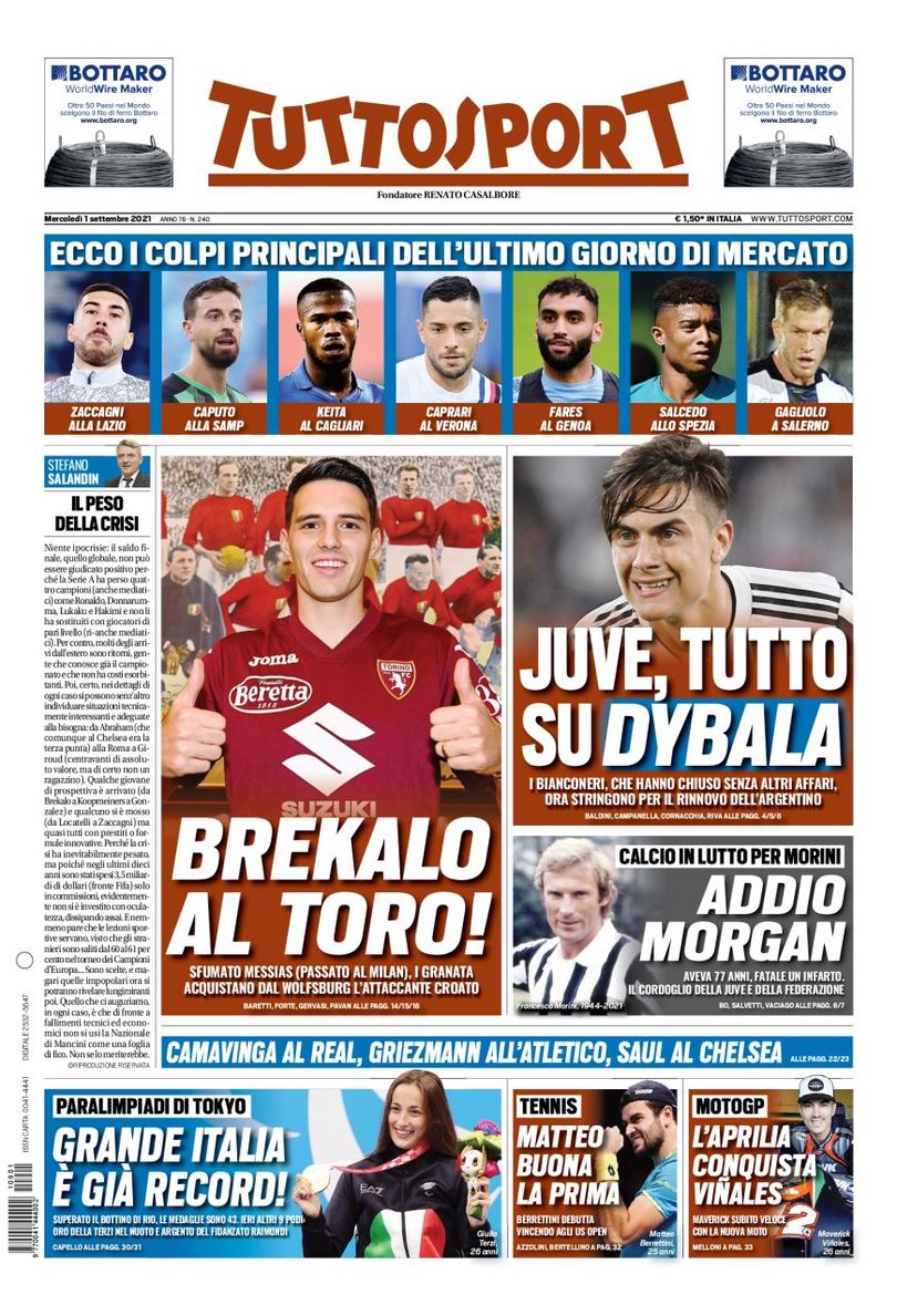 "Juve, tutto su Dybala", titola così in prima pagina Tuttosport, nell'edizione di oggi. "I bianconeri, che hanno chiuso senza altri affari, ora stringono per il rinnovo dell'argentino". Apertura dedicata al calciomercato che si è chiuso ieri: "Ecco i colpi principali dell'ultimo giorno di mercato". A centro pagina spazio al colpo in attacco del Torino: "Brelalo al Toro!"