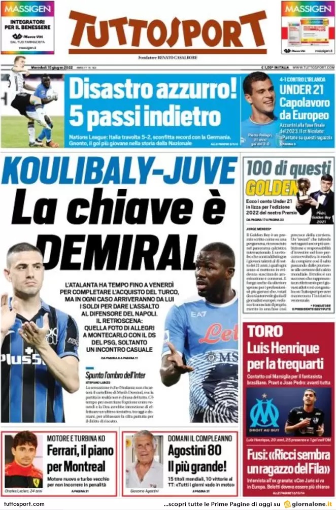 Nell'edizione di oggi Tuttosport apre in prima pagina con la Juve che prova l'assalto al centrale azzurro: "Koulibaly-Juve, la chiave è Demiral. L'Atalanta ha tempo fino a venerdì per completare l'acquisto del turco, ma in ogni caso arriveranno da lui i soldi per dare l'assalto al difensore del Napoli". In taglio alto spazio al pesantissimo ko della Nazionale in Germania: "Disastro azzurro! 5 passi indietro". Di spalla il mercato del Torino: "Luis Henrique per la trequarti".