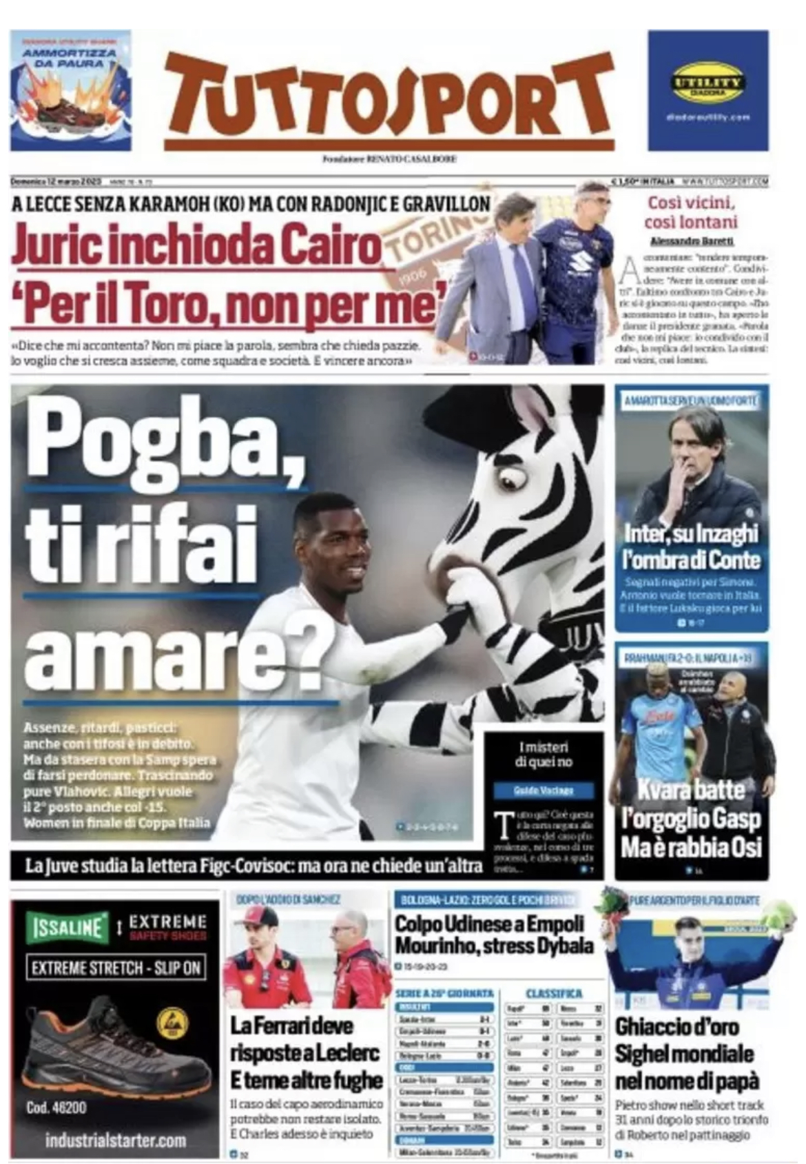 “Kvara batte l’orgoglio Gasp. Ma è rabbia Osi”. Titola così di spalla l’edizione odierna di Tuttosport in riferimento al successo per 2-0 del Napoli contro l'Atalanta. Al centro ampio spazio alla Juventus: "Pogba, ti rifai amare?". Sulla destra l'Inter: "Su Inzaghi l'ombra di Conte". In basso la vittoria dell'Udinese a Empoli.