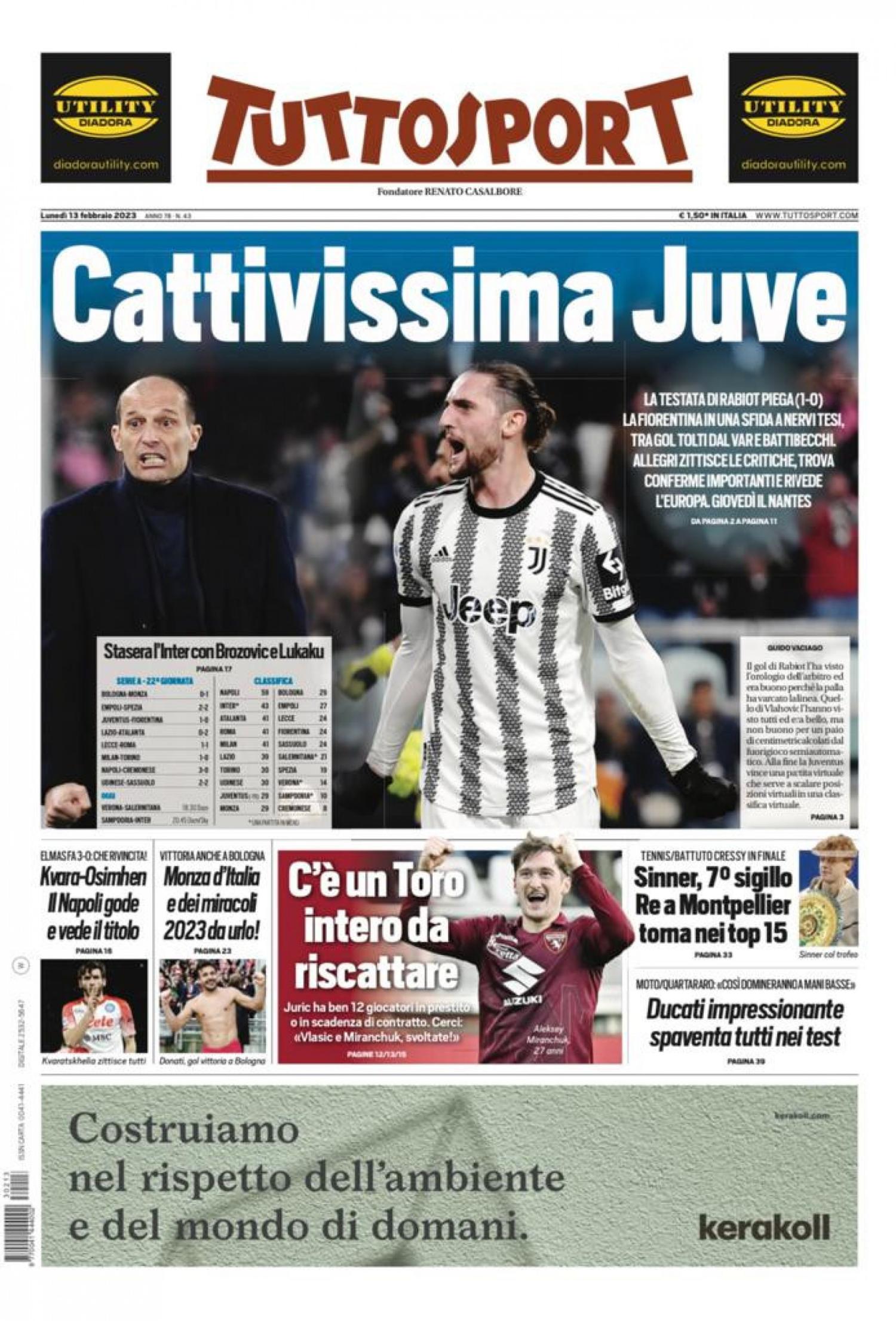 "Kvara-Osimhen, il Napoli gode e vede il titolo", titola così in prima pagina Tuttosport nell'edizione di oggi. Apertura dedicata alla vittoria della Juventus contro la Fiorentina: "Cattivissima Juve". In taglio basso spazio al Torino, con la situazione dei giocatori in prestito: "C'è un Toro intero da riscattare".