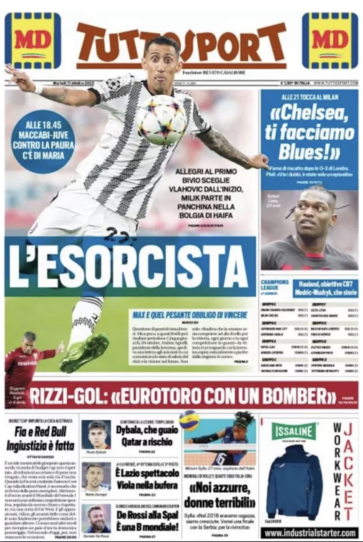 “L’esorcista”. E’ questa l’apertura di Tuttosport che apre con la Juventus: "Allegri al primo bivio sceglie Vlahovic dall'inizio, Milik parte dalla panchina nella bolgia di Haifa". In spalla spazio al Milan: "Chelsea ti facciamo Blues". In taglio basso l'infortunio di Dybala in casa Roma e il poker della Lazio alla Fiorentina.