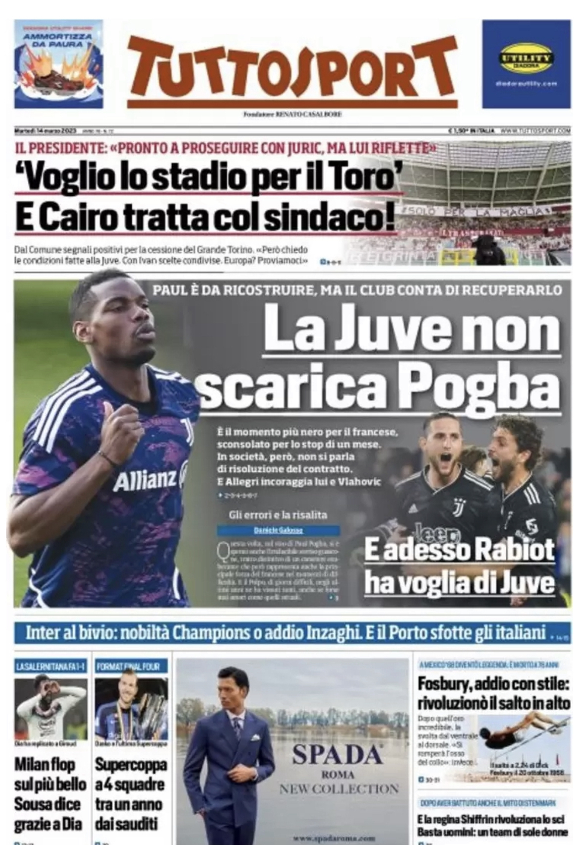 “La Juve non scarica Pogba”. Titola così di spalla l’edizione odierna di Tuttosport. "Paul è da ricostruire, ma il club conta di recuperarlo". In taglio alto le parole del presidente del Torino Urbano Cairo: "Voglio lo stadio per il Toro". Spazio anche all'Inter: "Al bivio: nobiltà Champions o addio Inzaghi. E il Porto sfotte gli italiani". In taglio basso il pareggio del Milan contro la Salernitana e il nuovo format della Supercoppa italiana.