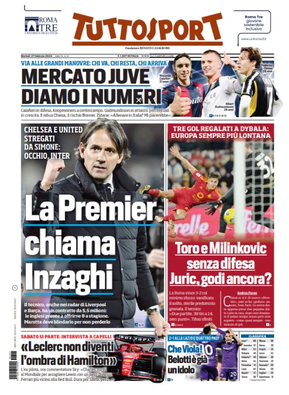 Nell'edizione odierna, Tuttosport dedica spazio in prima pagina alla vittoria della Fiorentina sulla Lazio: "Che Viola! Belotti è già un idolo". Al centro, spazio alle voci di mercato sul tecnico dell'Inter: "La Premier chiama Inzaghi". In taglio alto, spazio al calciomercato in casa Juventus: "Mercato Juve: diamo i numeri".