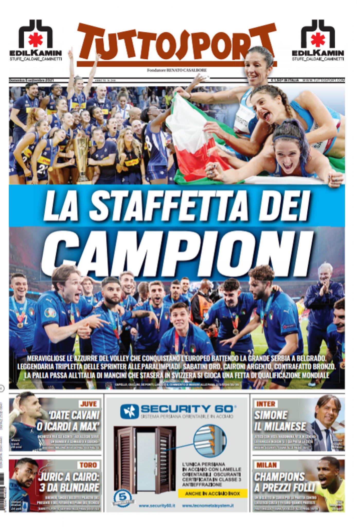 "La staffetta dei campioni", titola l'edizione odierna del quotidiano Tuttosport in riferimento ai successi azzurri. Stasera la palla alla nazionale di Mancini che si gioca una fetta di qualificazione.