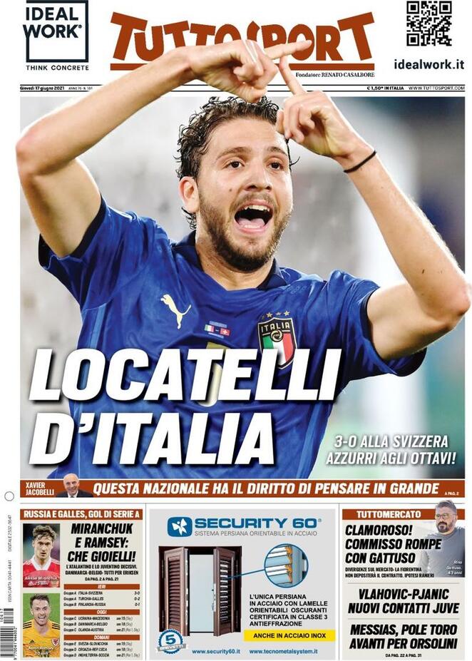 Tuttosport dedica la prima pagina di oggi a Locatelli autore della doppietta nel 3-0 dell'Italia contro la Svizzera: "Locatelli d'Italia. Azzurri agli ottavi!". Di spalla spazio alla rottura in casa viola: "Clamoroso! Commisso rompe con Gattuso". Più in basso notizia di mercato in casa Juve: "Vlahovic-Pjanic, nuovi contatti Juve".