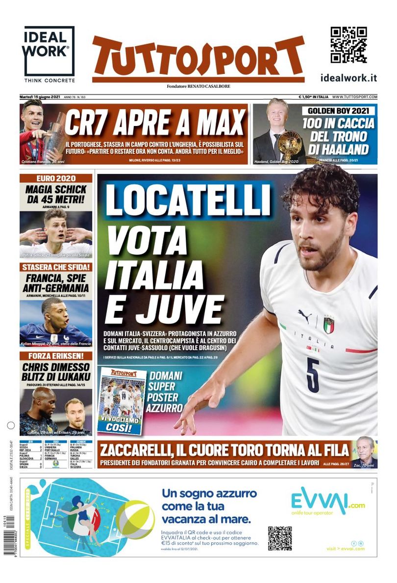 “Locatelli vota Italia e Juve”. Titola così Tuttosport che apre in prima pagina con il futuro di Manuel Locatelli. In alto si parla del futuro di Cristiano Ronaldo: "CR7 apre a Max". Sulla sinistra lo straordinario gol di Schick agli Europei e la sfida delle 21 tra Francia e Germania. Spazio anche a Eriksen: "Eriksen dimesso. Blitz di Lukaku".