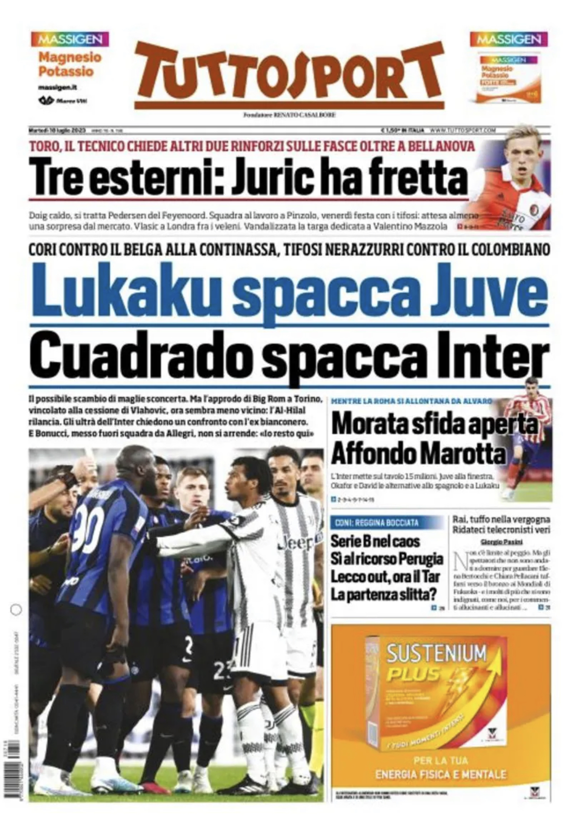 Tuttosport, nell'edizione di oggi, dedica ampio spazio al calciomercato in apertura: “Lukaku spacca Juve. Cuadrado spacca Inter. Cori contro il belga alla Continassa, tifosi nerazzurri contro il colombiano”. In taglio alto spazio al Torino: “Tre esterni: Juric ha fretta”. In basso il futuro di Morata: “Sfida aperta. Affondo Marotta”.