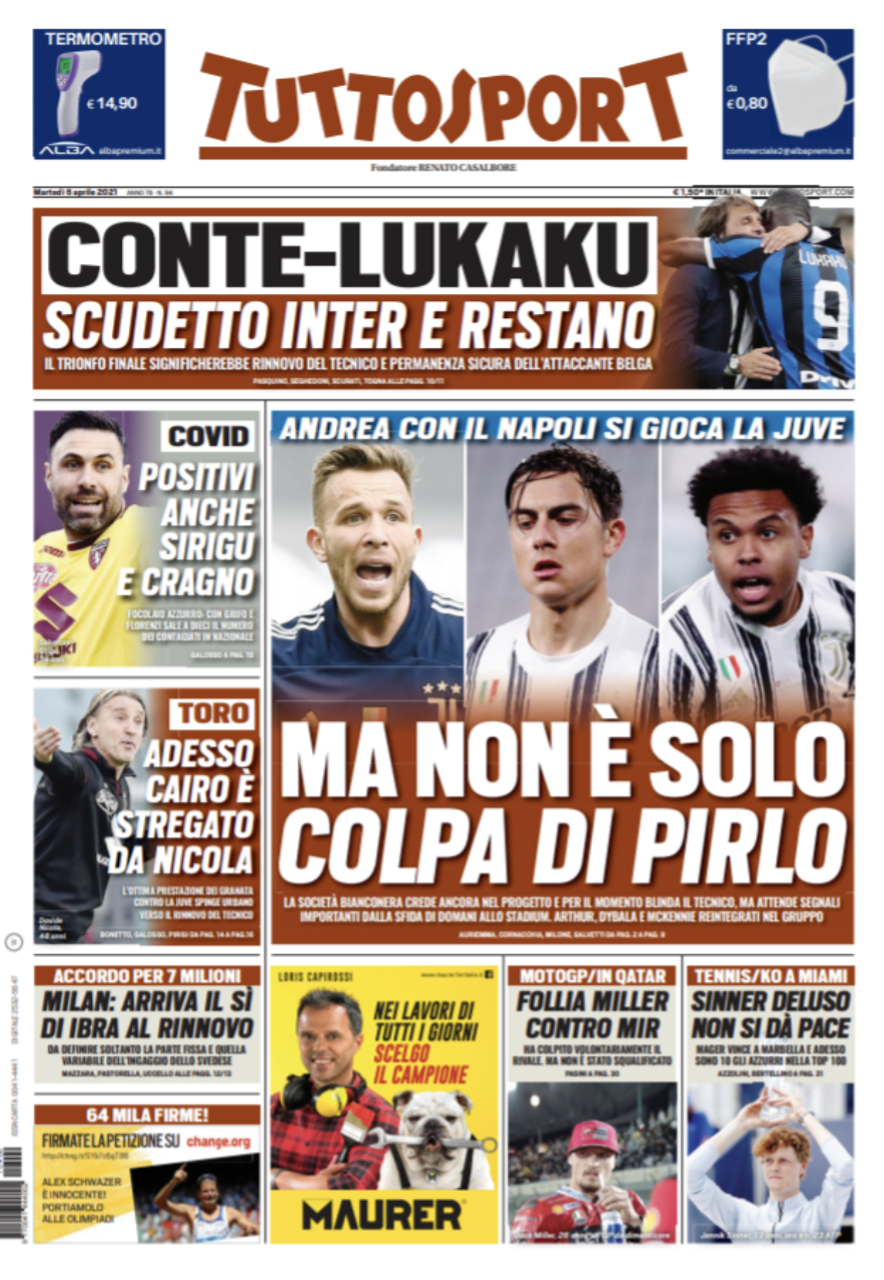 Tuttosport apre in prima pagina con la supersfida tra Juventus e Napoli e la situazione in casa bianconera: “Ma non è solo colpa di Pirlo. Andrea con il Napoli si gioca la Juve”. In taglio alto il futuro di Conte e Lukaku all'Inter: "Il trionfo finale significherebbe rinnovo del tecnico e permanenza sicura dell'attaccante belga". Di spalla i nuovi casi di Covid-19 tra le fila della Nazionale italiana e le notizie sul rinnovo di Ibrahimovic con il Milan.