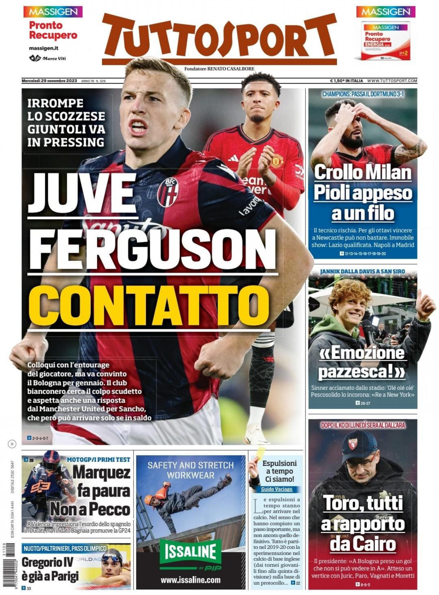 "Juve-Ferguson contatto" titola così in apertura in prima pagina Tuttosport nell'edizione odierna. Di spalla spazio alla sconfitta del Milan in Champions League contro il Borussia Dortmund: "Crollo Milan, Pioli appeso a un filo". Nello spazio in basso la crisi del Torino: "Toro, tutti a rapporto da Cairo".
