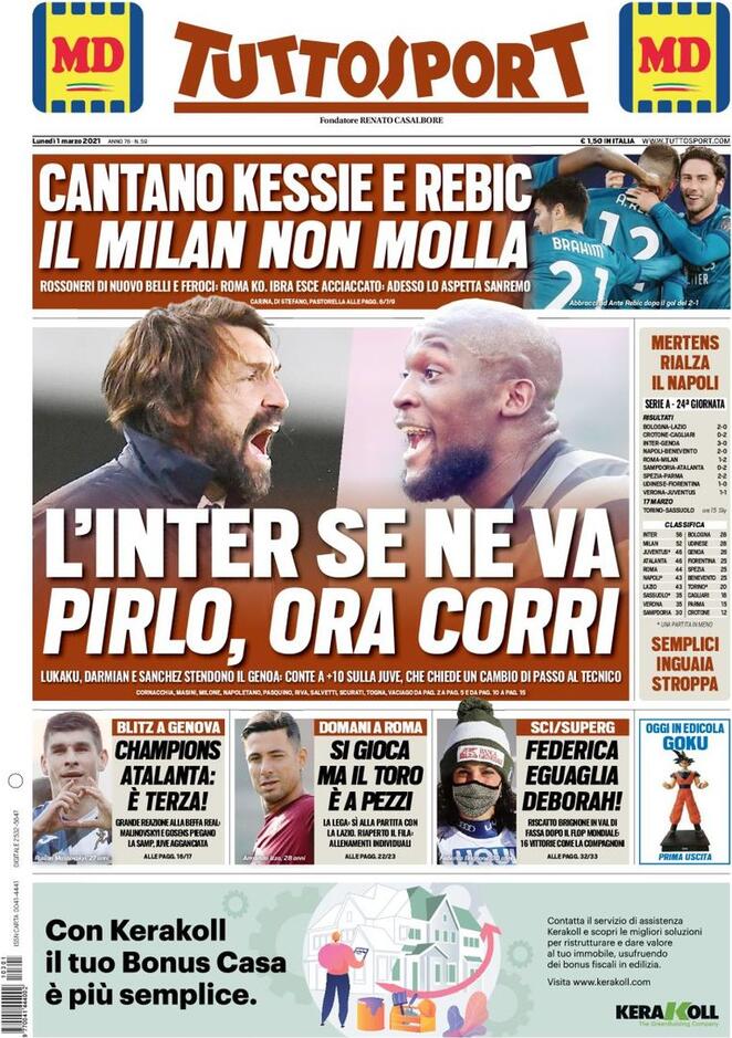 Titolo di Tuttosport in prima pagina, nella sua edizione di oggi, per il ritorno alla vittoria degli azzurri in campionato nel derby contro il Benevento: "Mertens rialza il Napoli". A centro pagina spazio alla lotta per lo scudetto, con la Juventus che ormai sembra essere tagliata fuori: "L'Inter se ne va Pirlo, ora corri"; e col Milan che vince a Roma: "Cantano Kessie e Rebic, il Milan non molla".