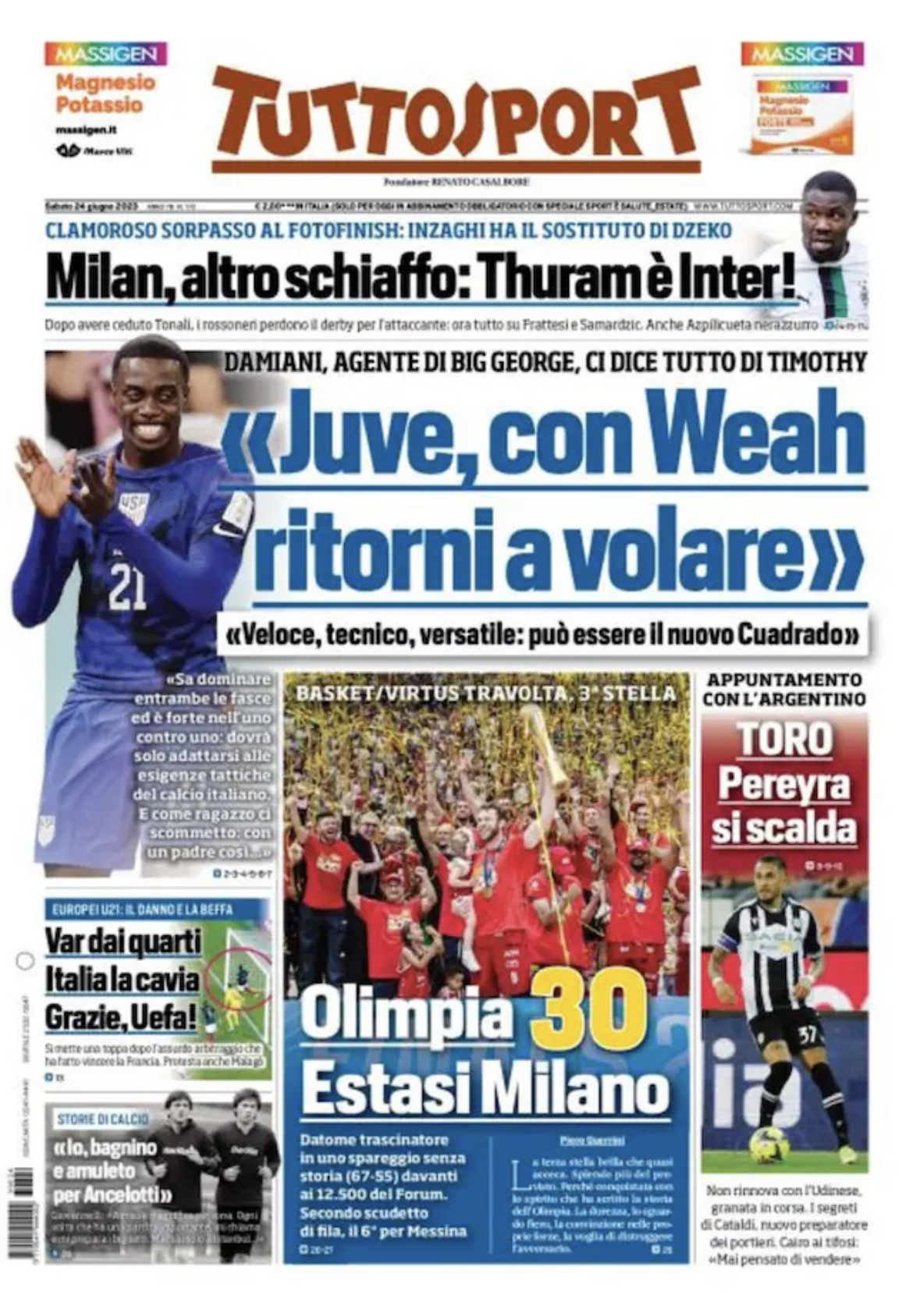 “Milan, altro schiaffo: Thuram è Inter!”. Titola così in taglio alto l’edizione odierna di Tuttosport. "Clamoroso sorpasso al fotofinish: Inzaghi ha il sostituto di Dzeko". Al centro spazio ad un'intervista ad Oscar Damiani che parla di Timothy Weah, prossimo acquisto della Juventus. In taglio basso il mercato del Torino: "Si scalda Pereyra".