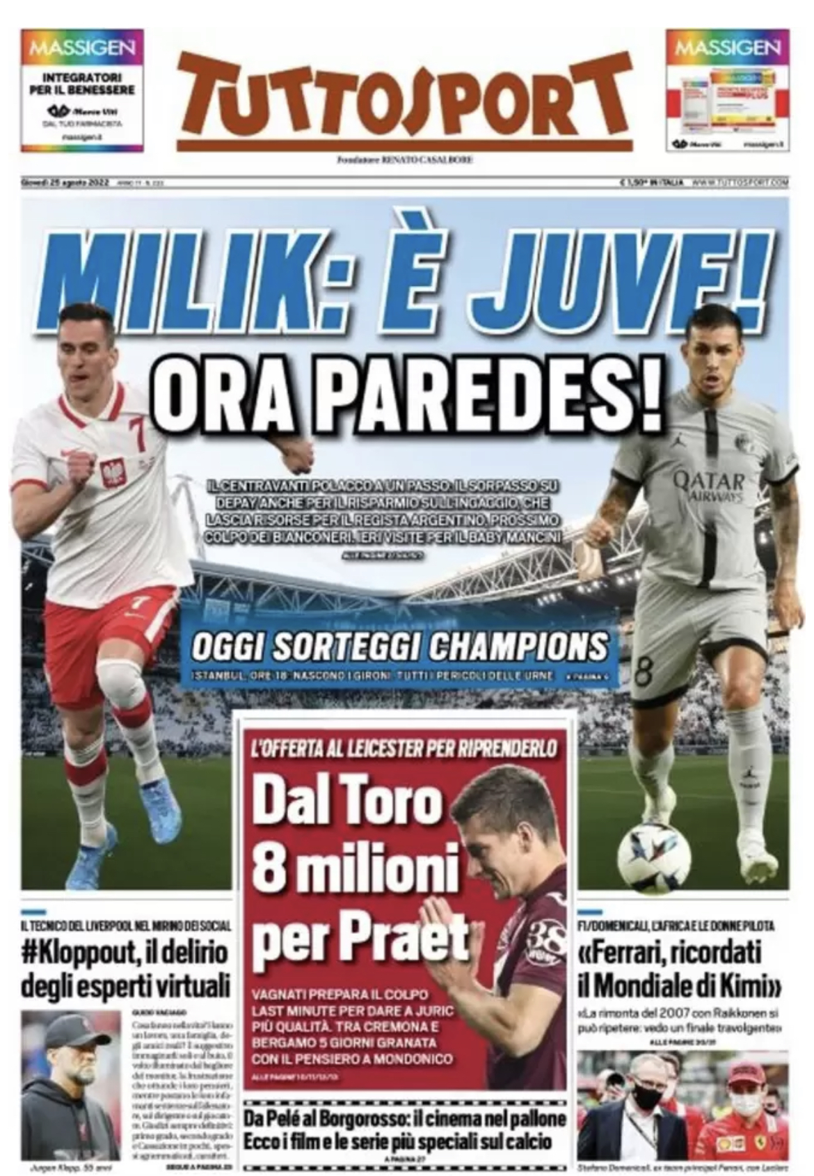 “Milik: è Juve! Ora Paredes!”. E’ questa l’apertura di Tuttosport che apre con le mosse di mercato della Juventus. "Il centravanti polacco a un passo. Il sorpasso su Depay anche per il risparmio sull'ingaggio che lascia risorse per il regista argentino, prossimo colpo dei bianconeri". Oggi ci sono anche i sorteggi per la prossima edizione della Champions League. Spazio al centro anche al Torino: "Dal Toro 8 milioni per Praet".