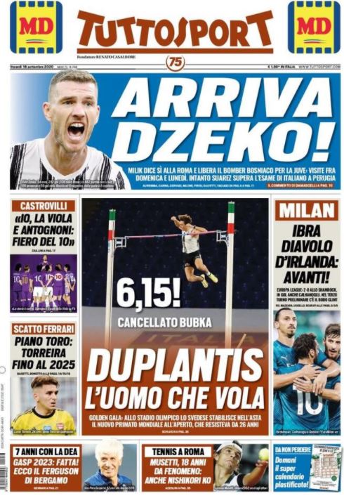 "Arriva Dzeko!". Questo il titolo di apertura in prima pagina di Tuttosport sulla Juventus stamattina. Milik dice sì alla Roma e libera il bomber bosniaco per i bianconeri: visite fra domenica e lunedì. Intanto Suarez supera l'esame di italiano sostenuto a Perugia.