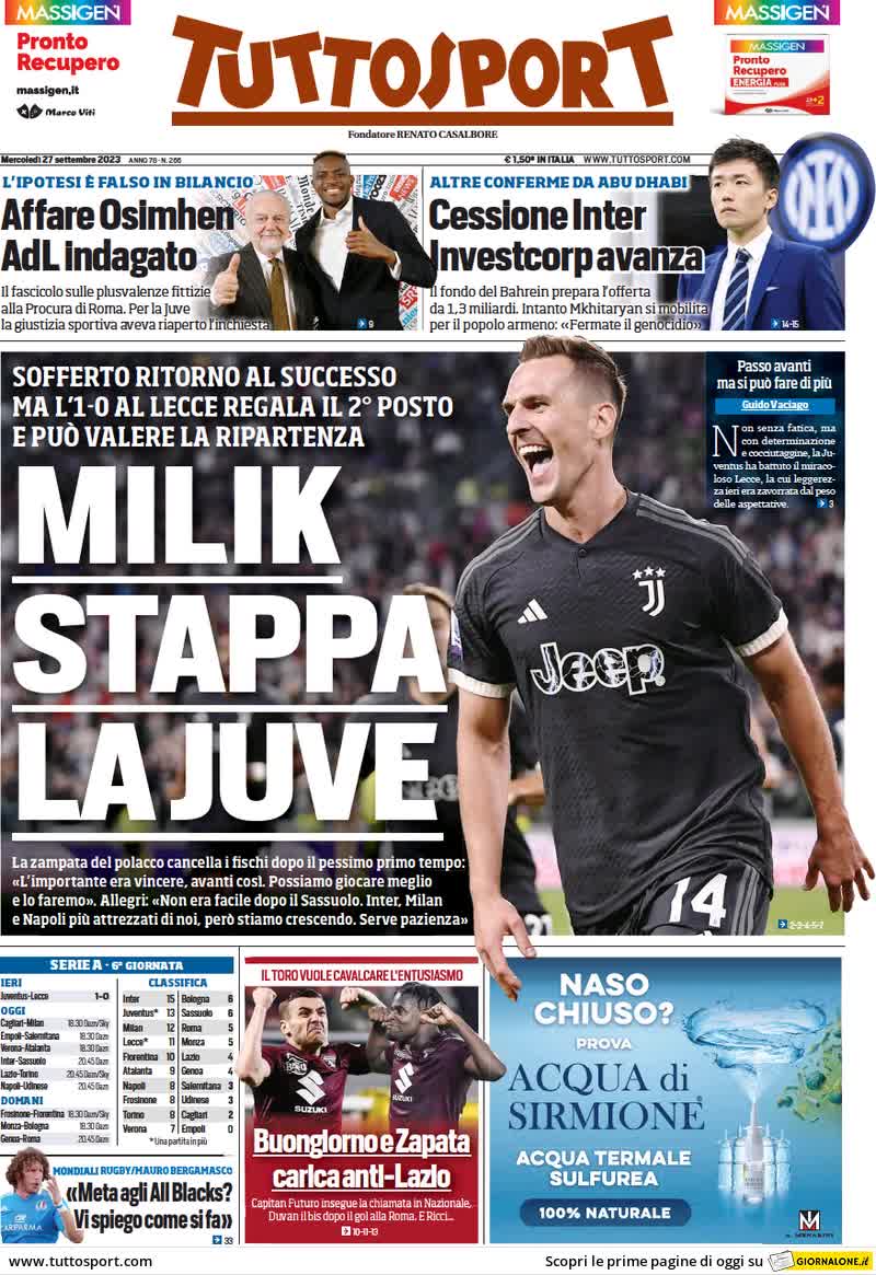 "Milik stappa la Juve". Titola così il quotidiano Tuttosport soffermandosi sulla vittoria della Juventus, che ieri sera ha battuto il Lecce nell'anticipo della sesta giornata di Serie A. I bianconeri all'Allianz Stadium sono riusciti a vincere grazie alla rete di Milik, cancellando il ko subito lo scorso fine settimana in casa del Sassuolo.