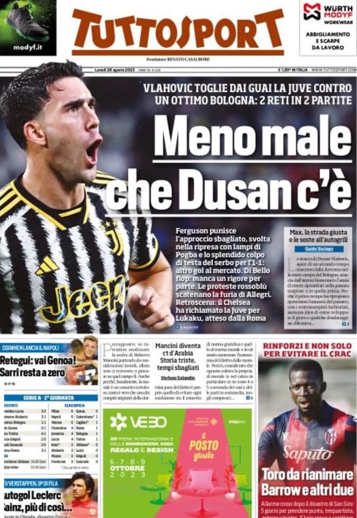 "Meno male che Dusan c'è", titola il quotidiano torinese Tuttosport, vicino alle vicende bianconere, senza dare risalto al rigore clamoroso negato al Bologna sull'1-0- "Manca un rigore per parte", si legge nel sommario a centro pagina. E poi "le proteste rossoblù scatenano la furia di Allegri".