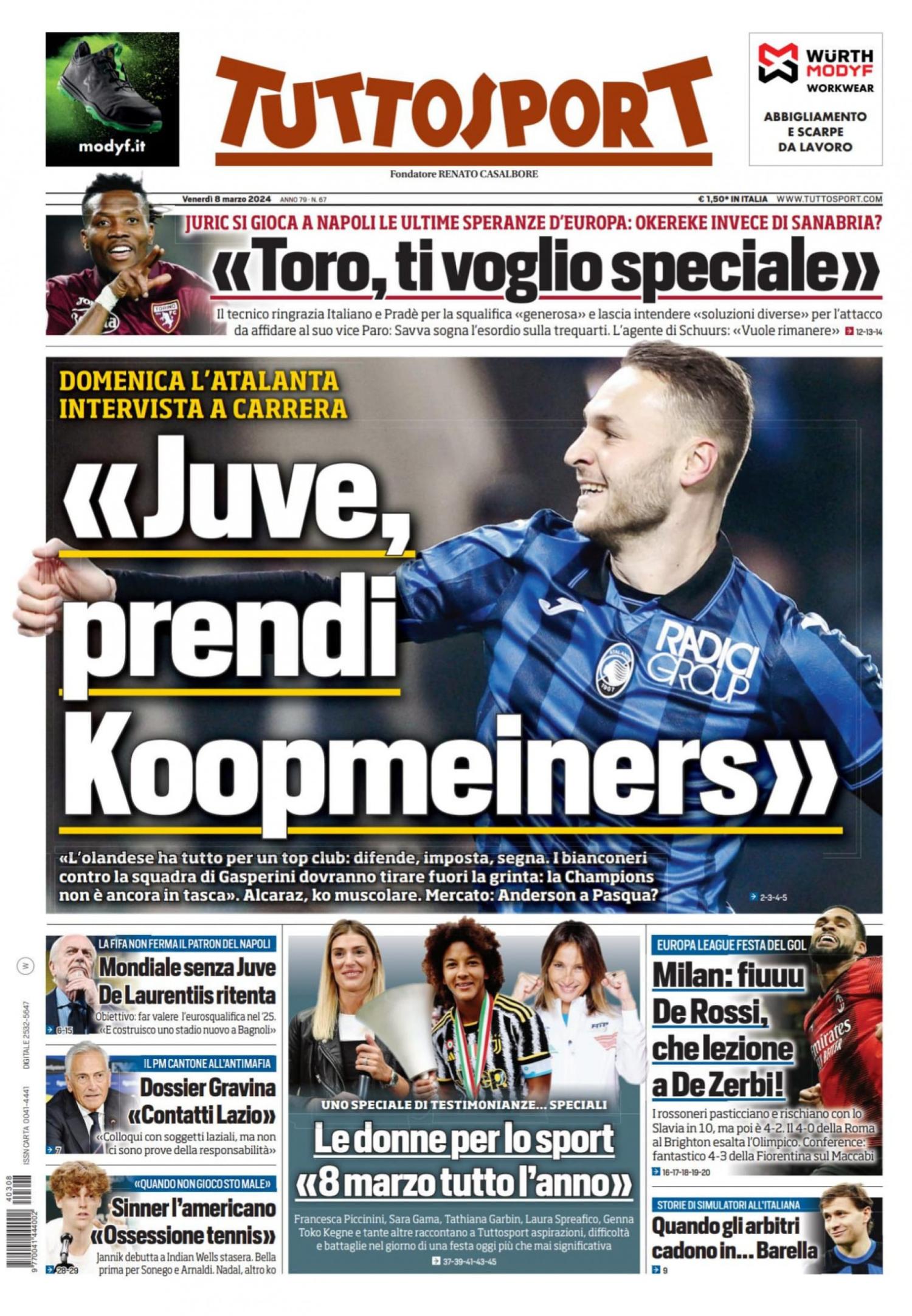 “Mondiale senza Juve, De Laurentiis ritenta”. Titola così in taglio basso l’edizione odierna di Tuttosport: "Obiettivo: far valere l'eurosqualifica nel '25. 'E costruisco uno stadio nuovo a Bagnoli'". Al centro l'intervista a Carrera che consiglia la Juventus: "Prendi Koopmeiners". In taglio alto il Torino e di spalla le vittorie di Milan, Roma e Fiorentina in Europa e Conference League.