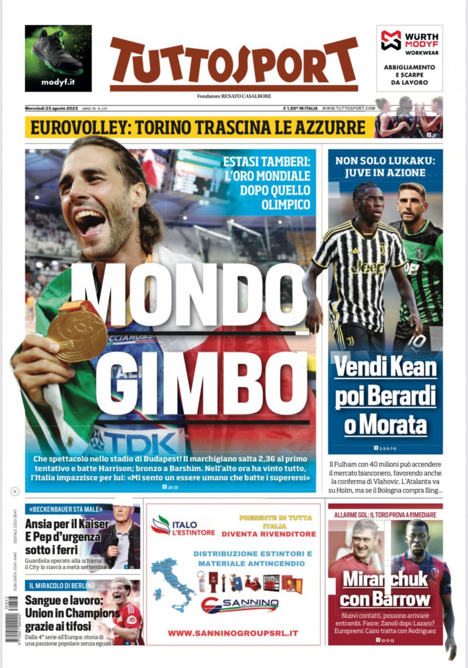 Tuttosport, nell'edizione odierna, apre in prima pagina con la vittoria di Gianmarco Tamberi ai Mondiali di Atletica nel salto in alto: "Mondo Gimbo. Estasi Tamberi: l'oro mondiale dopo quello olimpico". Spazio nel taglio alto anche alle ragazze dell'ItalVolley guidate da Mazzanti che ha Torino si sono assicurate il primo posto nel girone: "Eurovolley, Torino trascina le azzurre". Di spalla spazio al mercato Juve: "Vendi Kean, poi Berardi o Morata".
