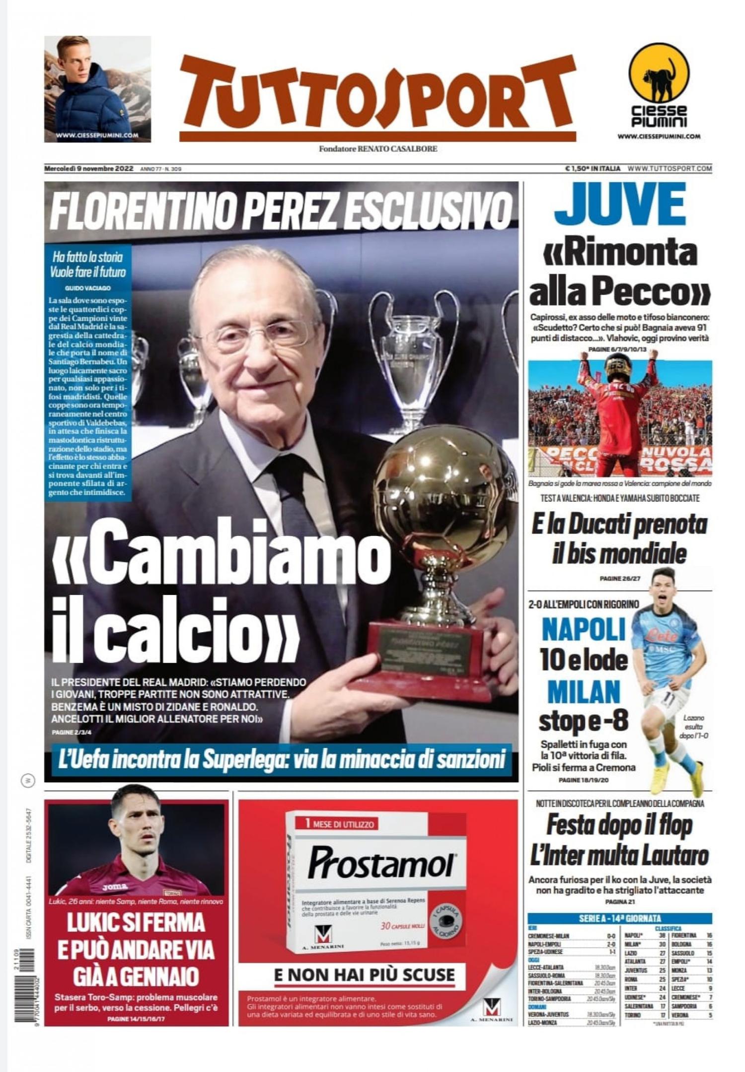 Tuttosport, nell'edizione di oggi, titola di spalla in prima pagina: "Napoli 10 e lode. Milan stop e -8. Spalletti in fuga con la 10ª vittoria di fila. Pioli si ferma a Cremona". In apertura l'intervista esclusiva al presidente del Real Madrid Florentino Perez: 'Cambiamo il calcio'". Di spalla spazio al caso Lautaro: "Festa dopo il flop. L'Inter multa Lautaro".