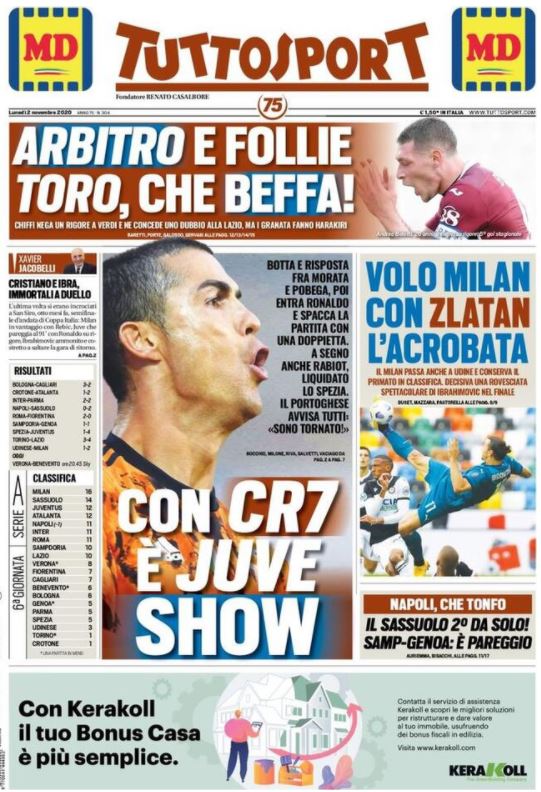 L'edizione odierna di Tuttosport apre con il titolo: "Con CR7 è show Juve". Bastano tre minuti al campione portoghese per riprendere per mano la Juventus e guidarla alla vittoria: Cristiano Ronaldo è entrato nella ripresa contro lo Spezia e dopo soli tre minuti aveva già portato in vantaggio i bianconeri, su precisa imbeccata di Morata. Poi la doppietta è arrivata con un cucchiaio su rigore, che ha arrotondato a 4 a 1 il risultato sui liguri. Il portoghese avvisa: "Sono tornato!".