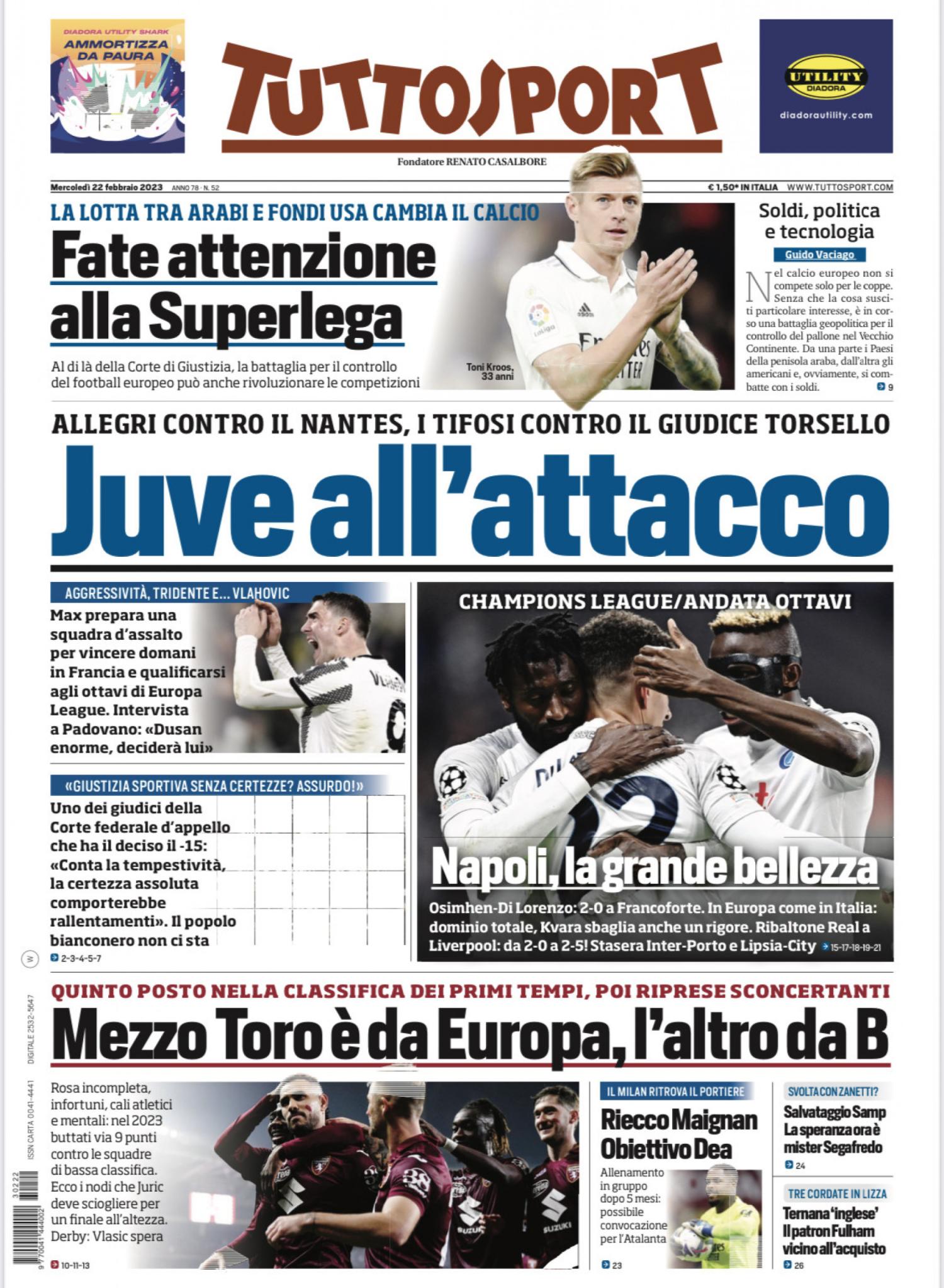 "Juve all'attacco", apre così Tuttosport alla vigilia della gara di ritorno di Europa League tra i bianconeri e il Nantes. In taglio la vitoria del Napoli in Champions a Francoforte: "Napoli, la grande bellezza". In taglio basso spazio al Torino: "Mezzo Toro è da Europa, l'altro da B". In taglio un focus sul calcio europeo: "Fate attenzione alla Superlega".
