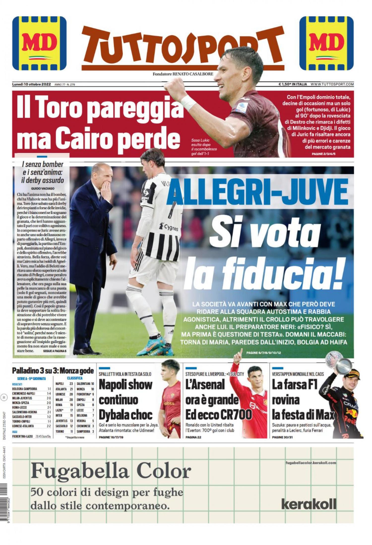 "Napoli show continuo", titola così in prima pagina nell'edizione odierna Tuttosport. "Spalletti vola in testa da solo". In apertura spazio alla Juve, che per ora decide di andare avanti con Allegri: "Allegri-Juve: si vota la fiducia". In taglio alto il pari del Torino con l'Empoli: "Il Toro pareggia, ma Cairo perde". In taglio basso spazio al brutto inforturnio della Joya: "Dybala choc".