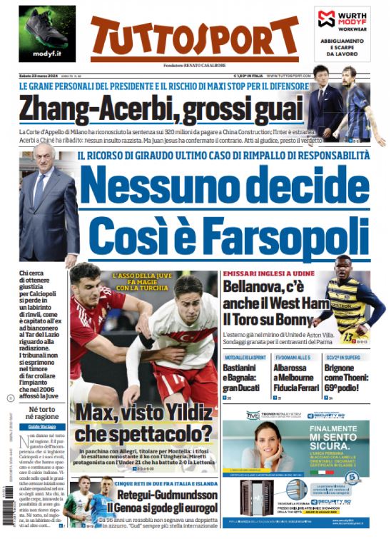 Nell'edizione odierna, Tuttosport apre in prima pagina parlando del ricorso di Giraudo: "Nessuno decide. Così è Farsopoli". Il sommario: "Il ricorso di Giraudo ultimo caso di rimpallo di responsabilità". Il taglio alto è riservato alla situazione in casa Inter: "Zhang-Acerbi, grossi guai". In taglio basso spazio alla Juventus: "Max, visto Yildiz che spettacolo?".