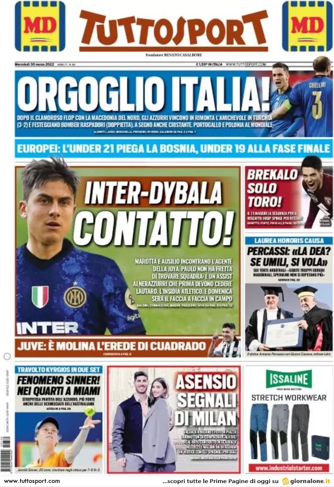 Nell'edizione di oggi, Tuttosport apre in prima pagina con la vittoria dell'Italia in Turchia: "Orgoglio Italia! Dopo il clamoroso flop con la Macedonia del Nord, gli azzurri vincono in rimonta l'amichevole in Turchia (3-2)". A centro pagina spazio al mercato in casa Inter: "Dybala-Inter: contatto!". Di spalla spazio alle parole del patron dell'Atalanta Percassi: "La Dea? Se umili, si vola".