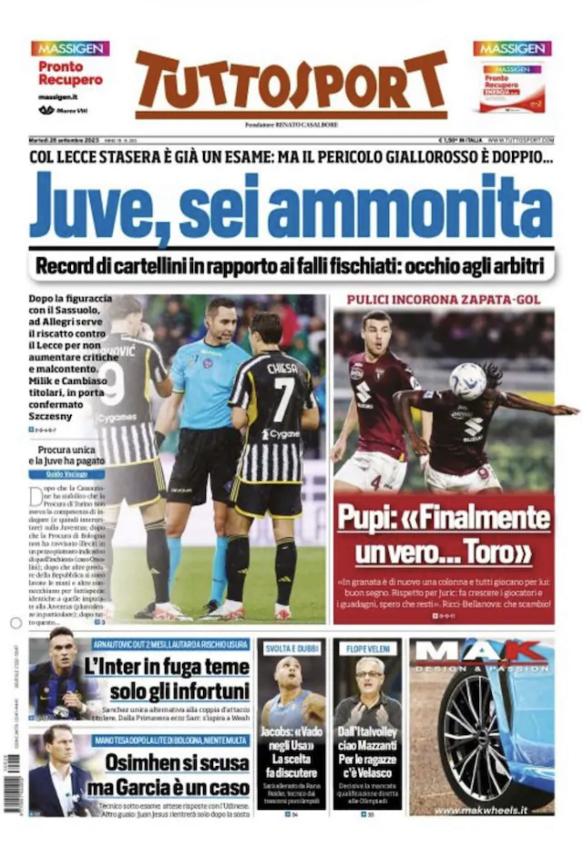 “Osimhen si scusa, ma Garcia è un caso”. Titola così in basso l’edizione odierna di Tuttosport: "Mano tesa dopo la lite di Bologna: niente multa. Tecnico sotto esame, attese risposte con l'Udinese. Altro guaio: Juan Jesus rientrerà solo dopo la sosta". Al centro ampio spazio alla Juventus, in campo questa sera contro il Lecce: "Juve, sei ammonita". In basso spazio anche all'Inter: "L'Inter in fuga teme solo gli infortuni".